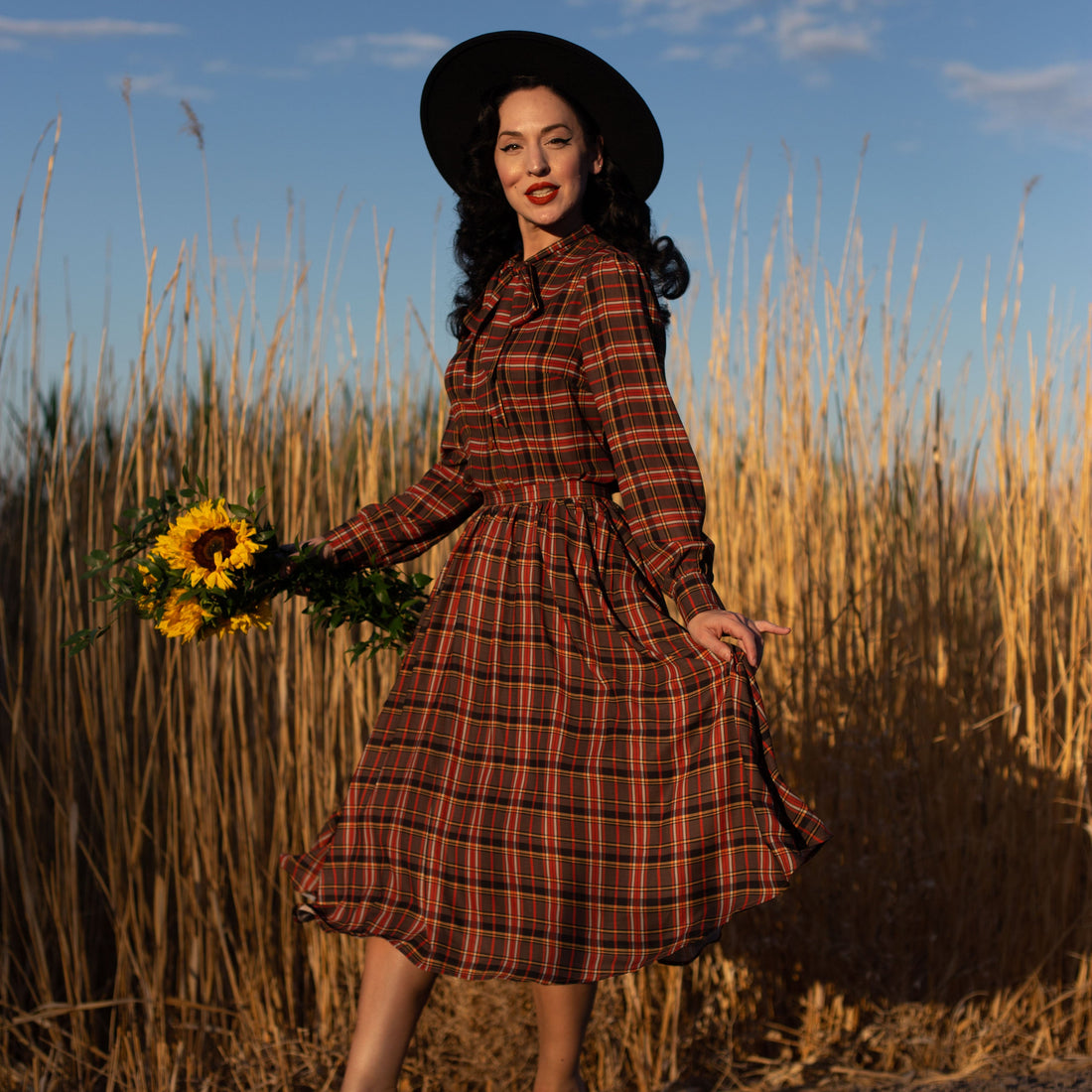 U-shaped collar checkered long sleeved slim fit belt retro dress for women