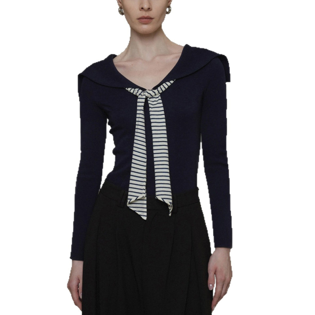 Vintage Navy Collar Knit Sweater Women Color-block Stripe Ribbon Slim Fit Stylish Top