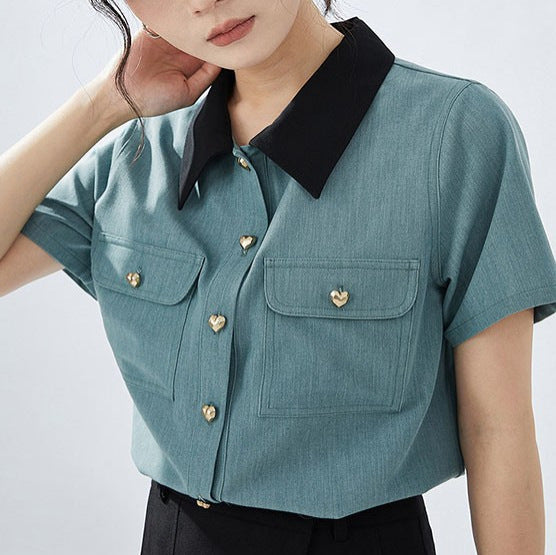 Color-block Turn-down Collar Shirt Women's Vintage Heart-shaped Button Style Elegant Top