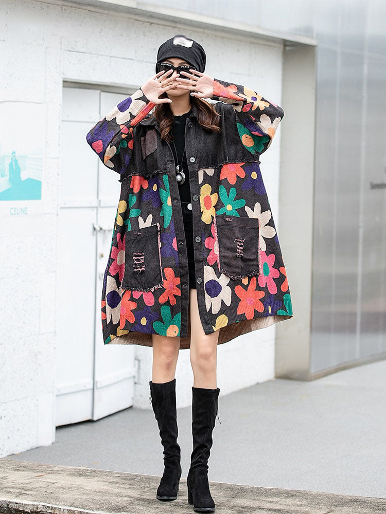 Fashion Knitting Jacket Vintage Splicing Contrast Color Flowers Pattern Autumn Loose Street Trendy All-match Coat