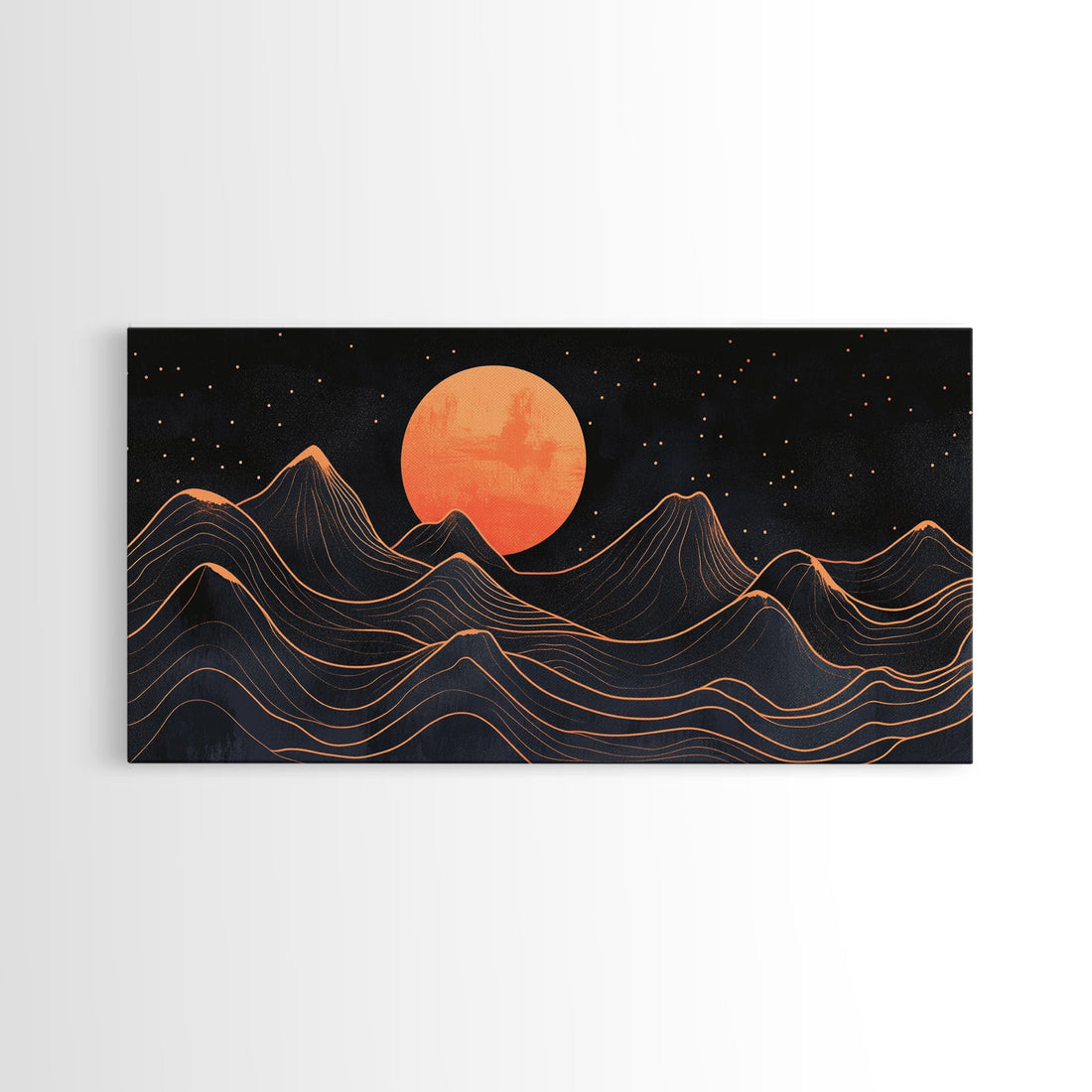 Art Deco Style Abstract Art, Orange Blood Moon Over Mountain Landscape, Retro Home Decor