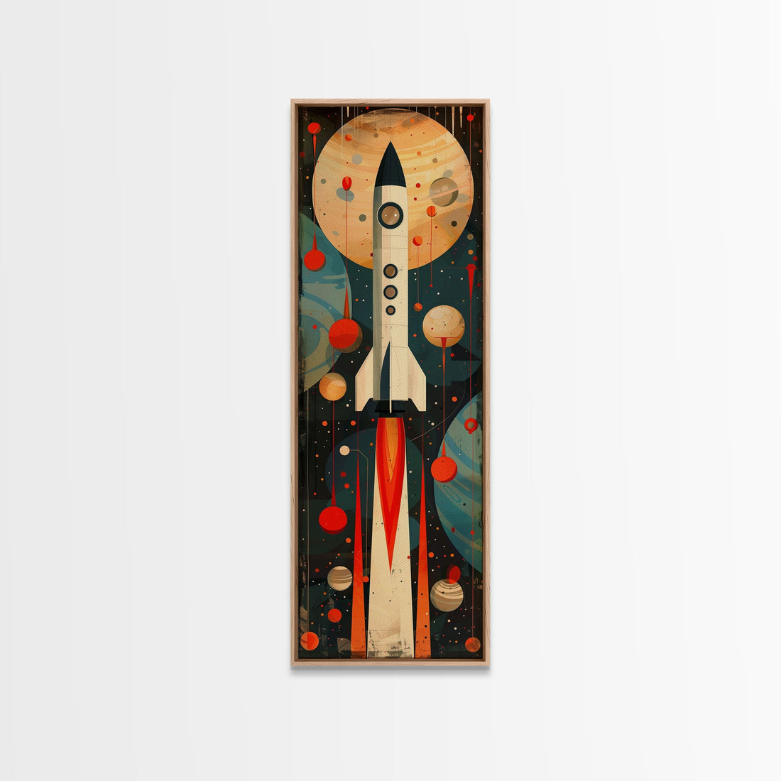 Vintage Rocket Launch Art - Framed Canvas Print, Midcentury Modern Skinny Art, Tall Wall Art for Living Room or Bedroom Decor