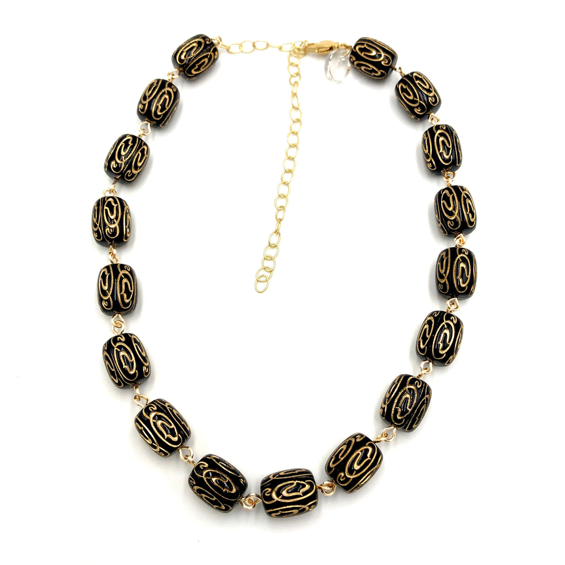 Black & metallic gold etched or 'carved' style beads in this Amelia necklace, were originally made...