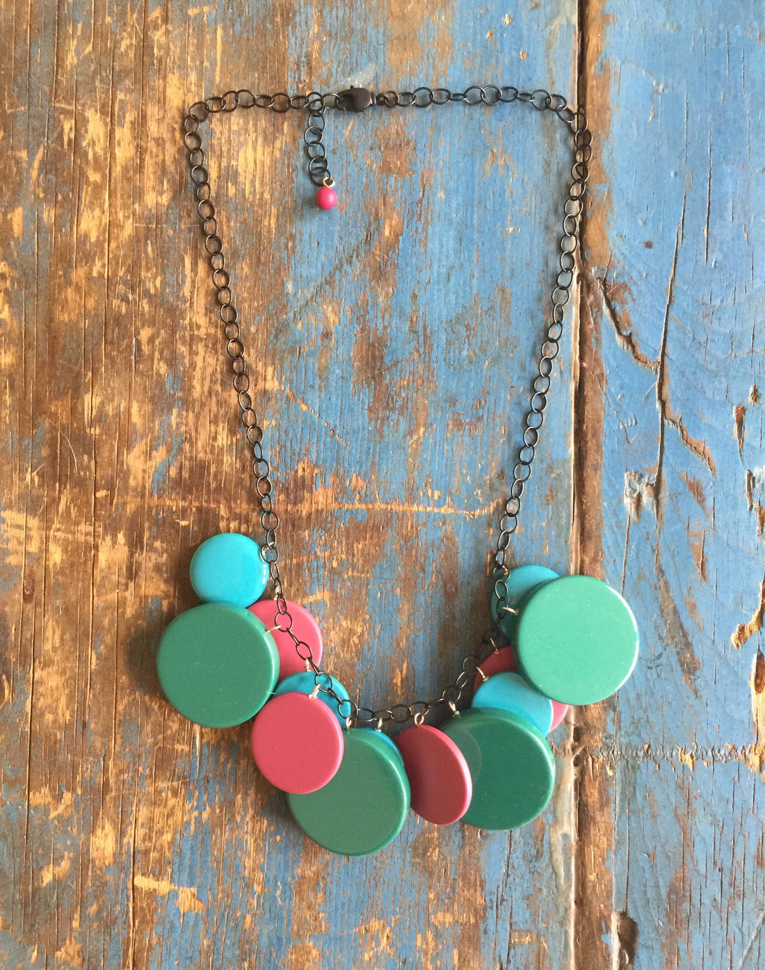 Magenta, teal & aqua lucite charms in matte & shiny finishes, in a retro poker chip collar style....