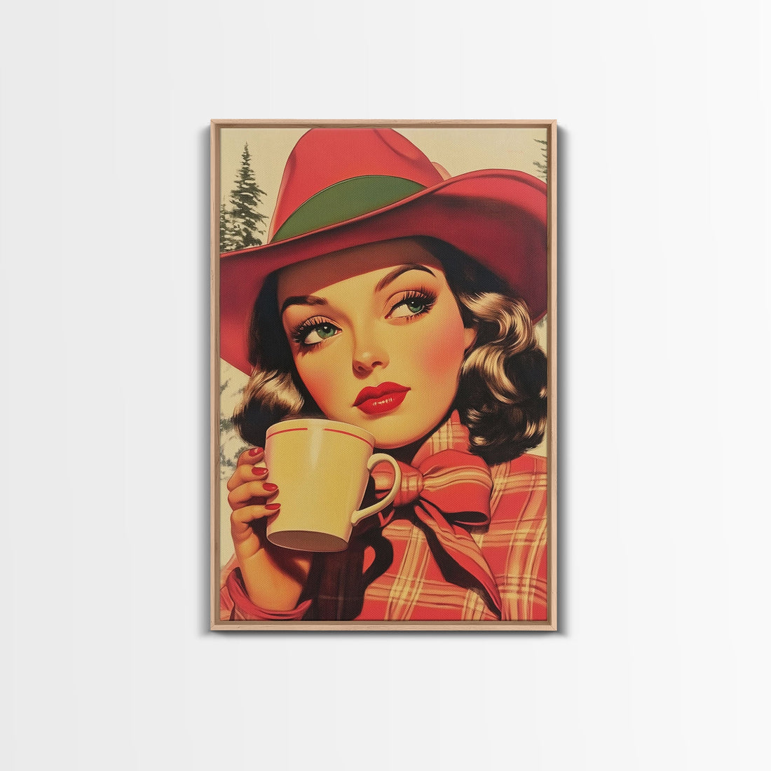 Retro Cowgirl Having A Cup Of Coffee, Framed Canvas Print, 1950s Style Wall Art, Vintage Art, Winter Decor, Watercolor Christmas Art