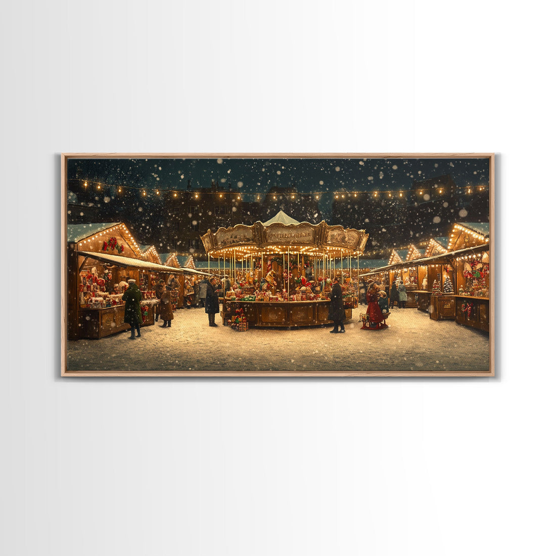 Retro Carousel Christmas Market Framed Canvas Print - Beautiful Vintage Christmas Decor and Holiday Wall Art with Christmas Scene