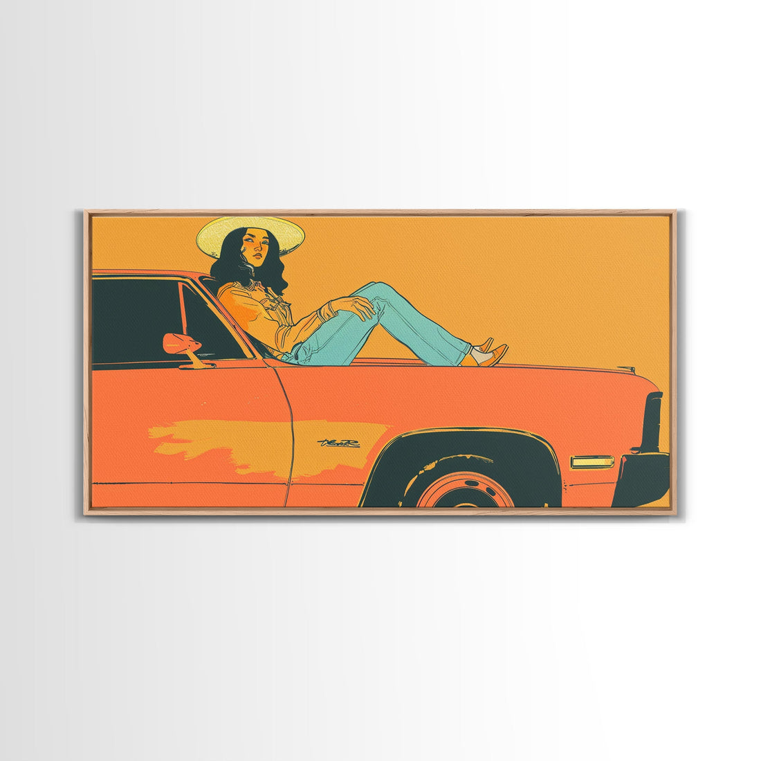 Relaxed Cowgirl Sitting on Car Hood, Retro Framed Canvas Print for Bedroom, Perfect Living Room Art, Vintage Wall Decor