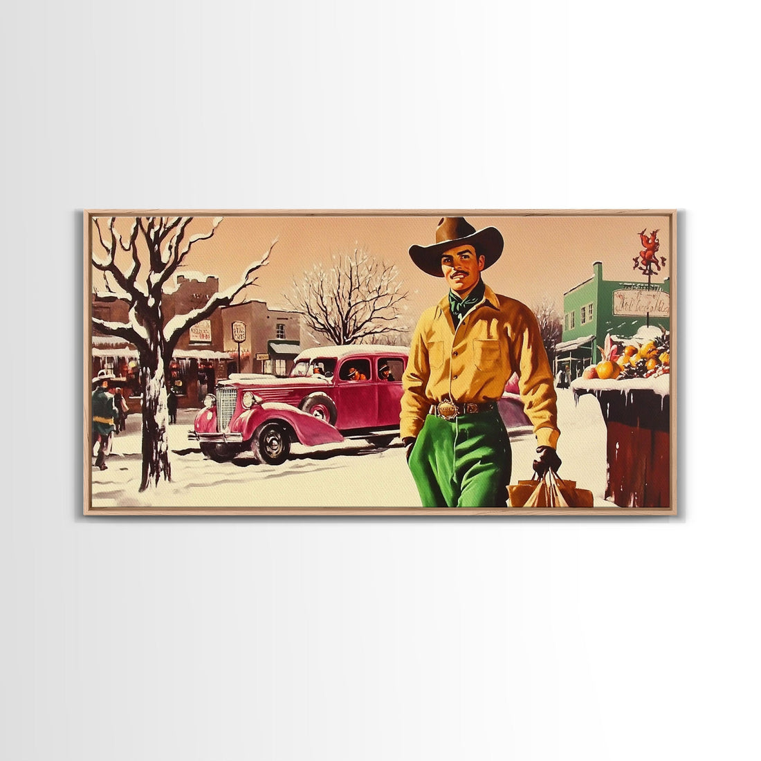 Retro 1950's Style Cowboy, Framed Canvas Print, Pastel Colors, Vintage Inspired Home Decor For Christmas