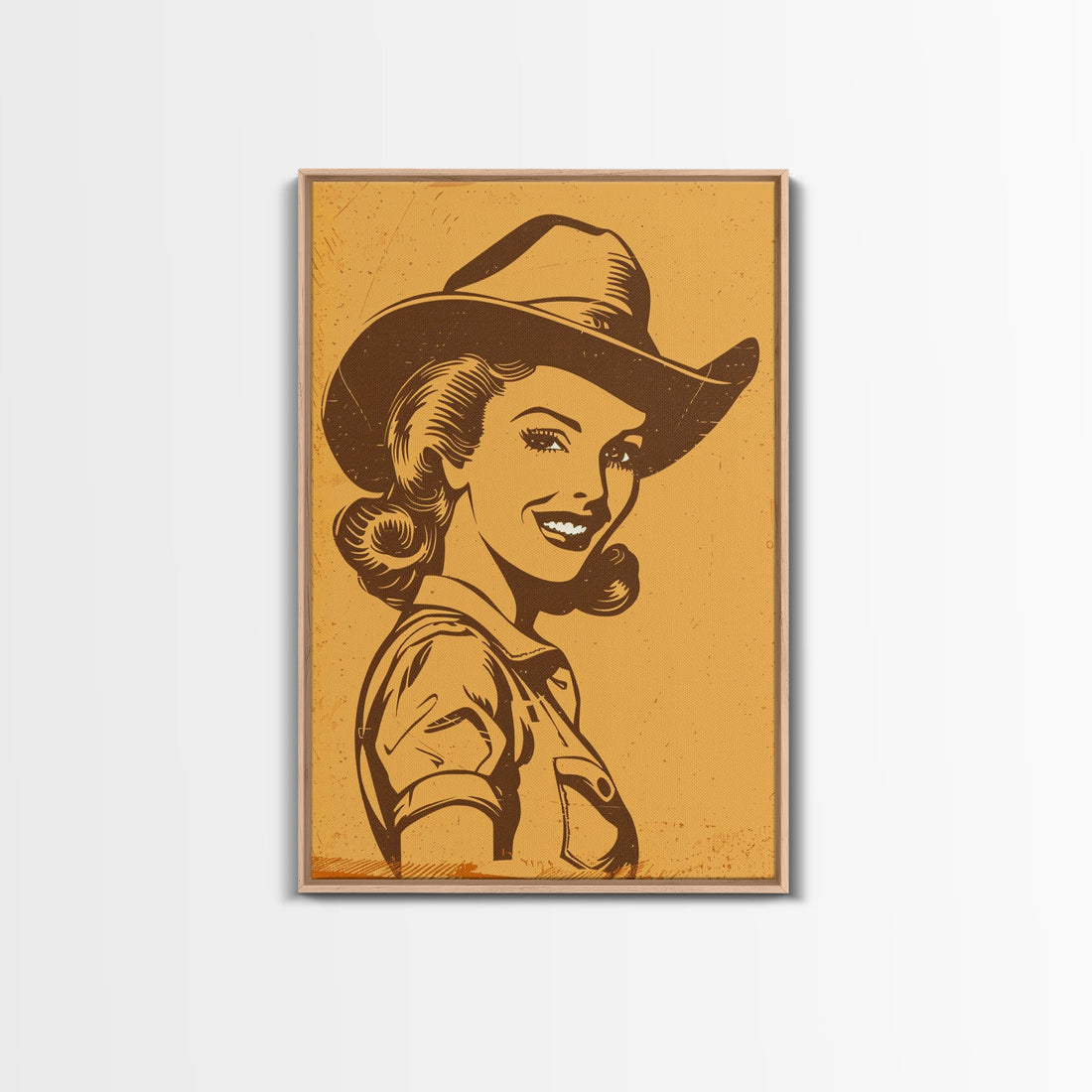 Smiling Retro Cowgirl in Hat Illustration | Framed Canvas Print | Vintage Western Art | Retro Cowgirl Wall Art for Bedroom Decor