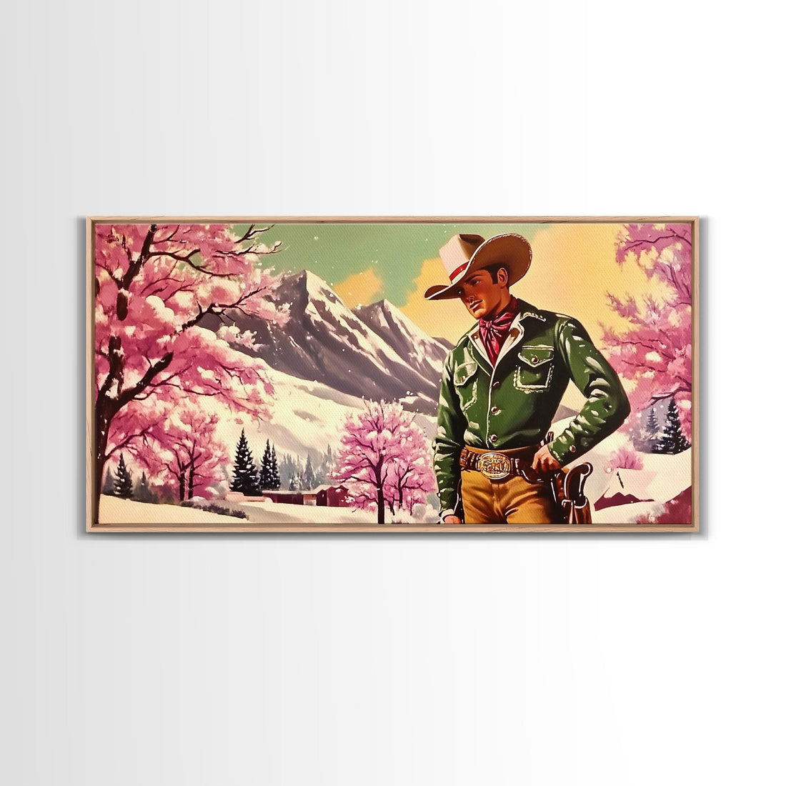 Retro Cowgirl with Snowy Background Canvas Print, Winter Wonderland Art, Christmas Wall Art, Seasonal Holiday Decor, Vintage Christmas Print