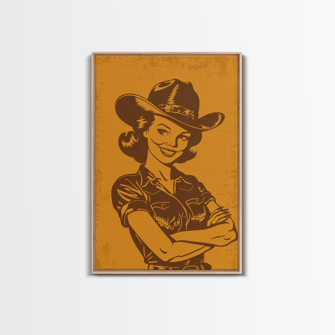 Retro Cowgirl Illustration in Yellow | Framed Canvas Print | Vintage Western Decor | Classic Cowgirl Wall Art for Living Room