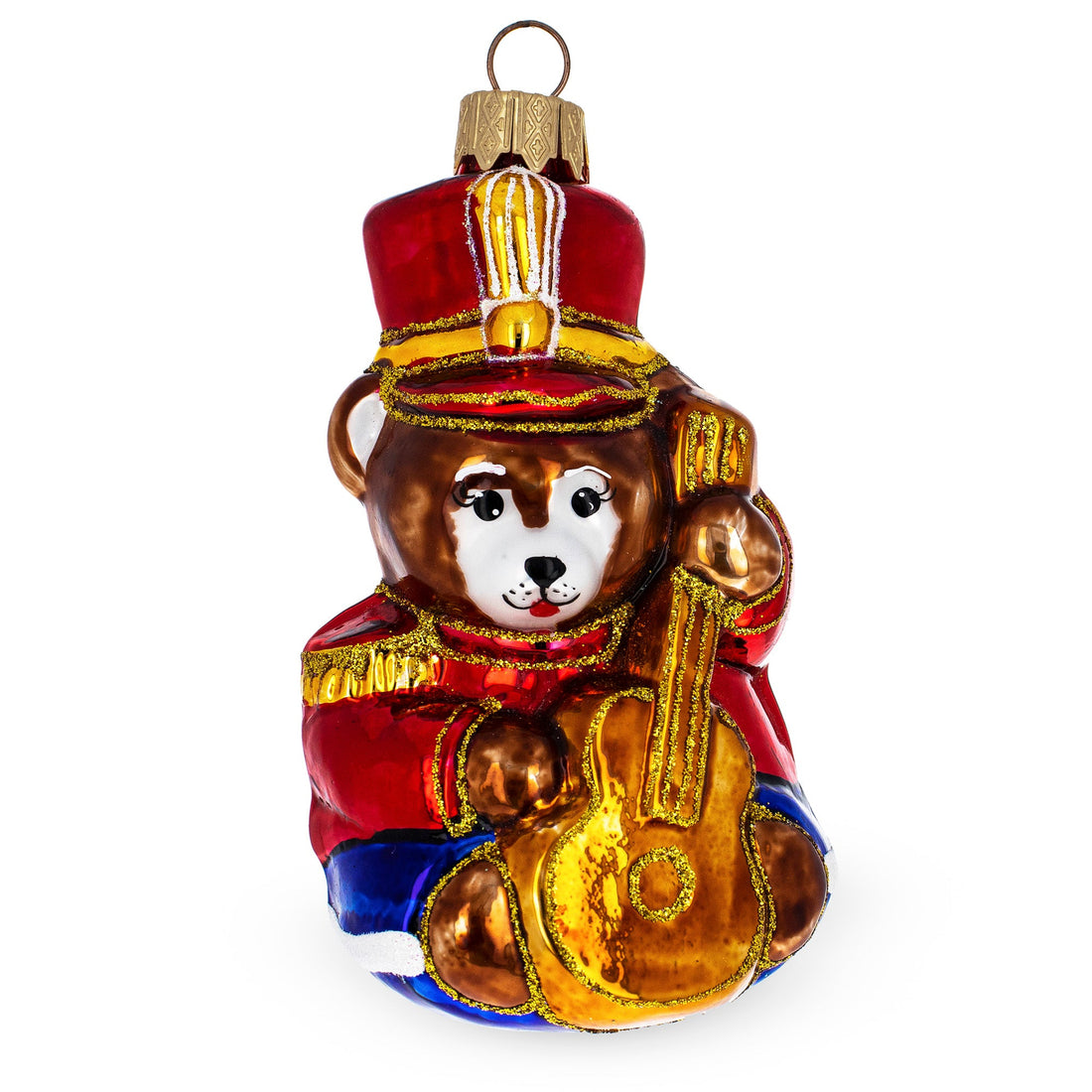 Teddy Bear Soldier with Guitar Glass Christmas Ornament