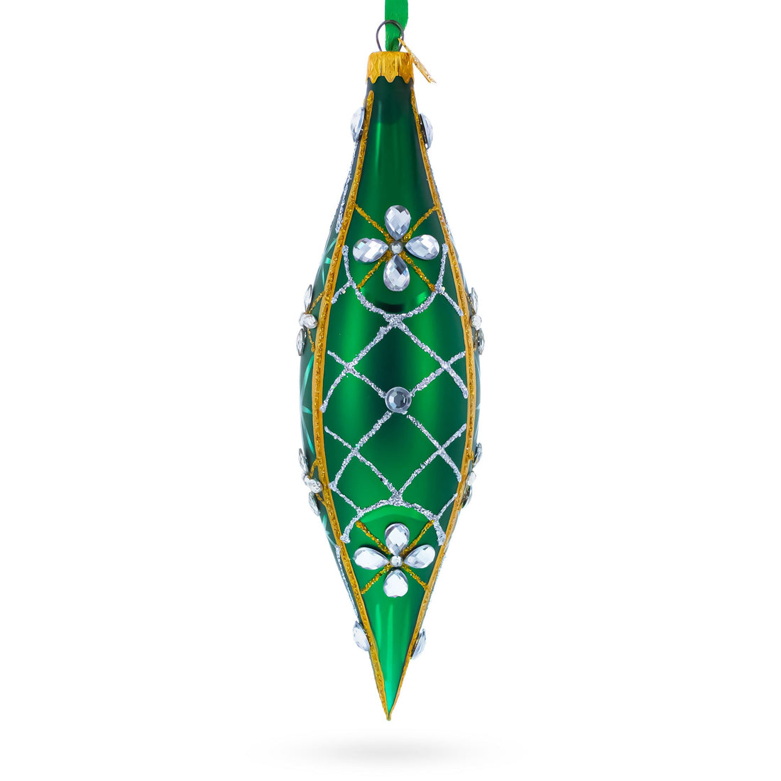 Emerald Jeweled Lattice Elongated Pointed Teardrop Finial Glass Christmas Ornament