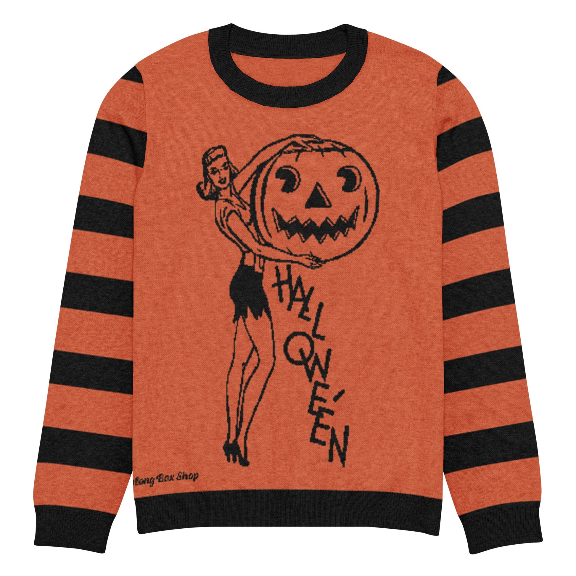 Our new All Hallows Eve Vintage Halloween Pinup unisex sweater just arrived! This fun design features a vintage pinup holding a pumpkin on the front with Halloween and on the back it says "All Hallows' Eve". With matching stripe sleeves this is the perfect sweater for any vintage Halloween fan.