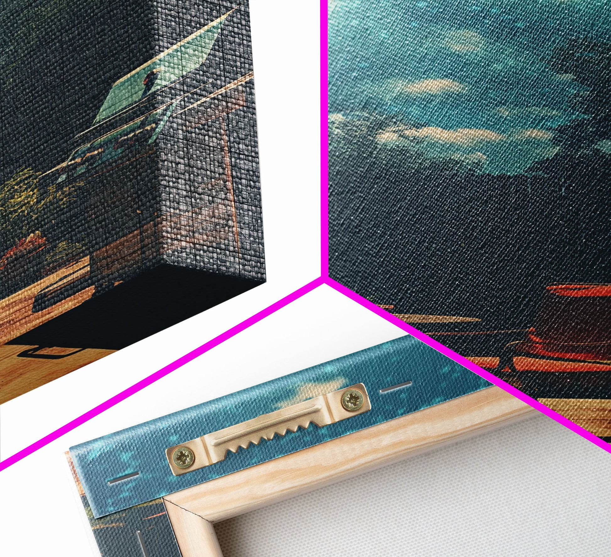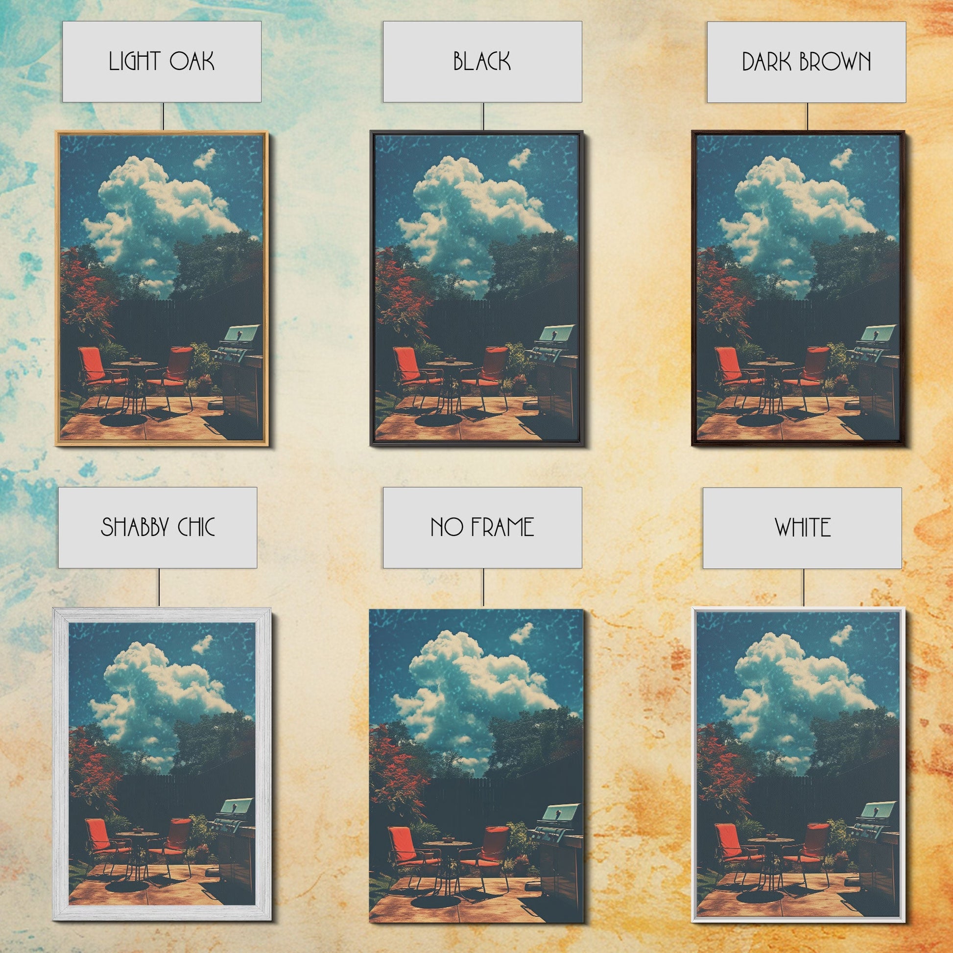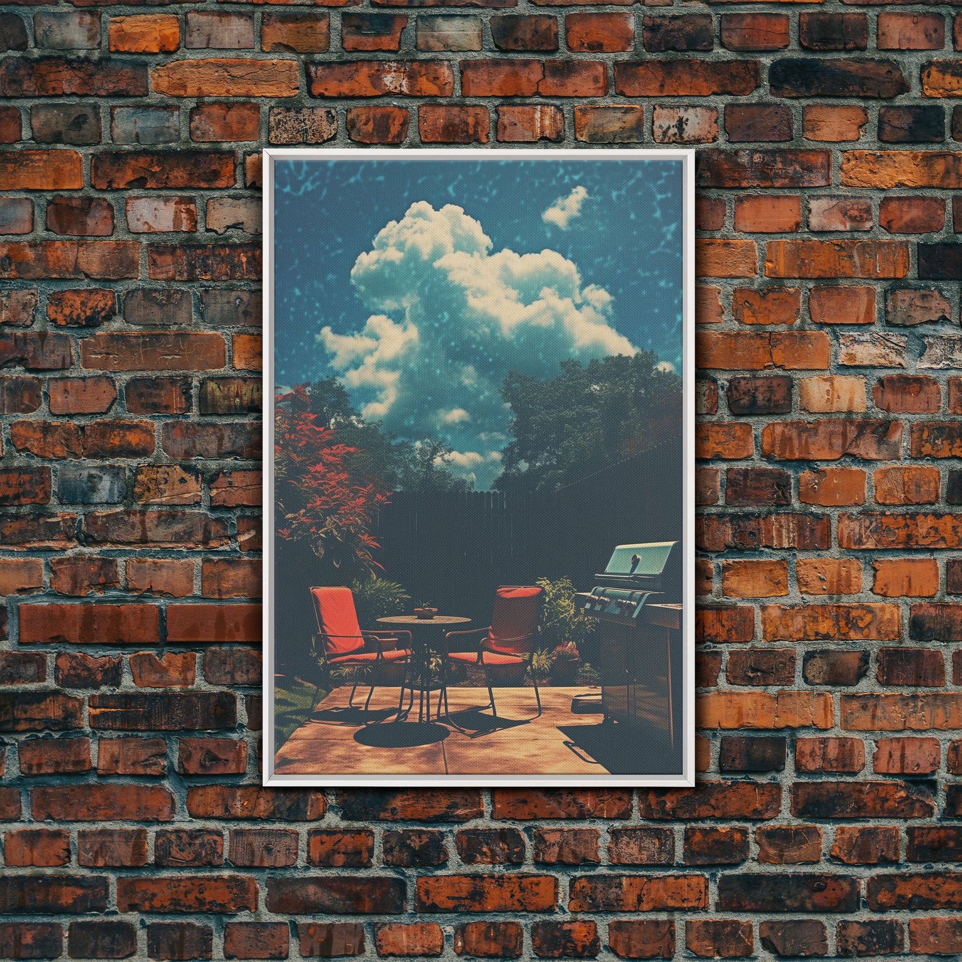 Back Yard Chillin', Summer Vibes, Framed Canvas Print, Retro Midcentury Modern BBQ Art, BBQ During An Eclipse, Liminal Art, Minimalist MCM
