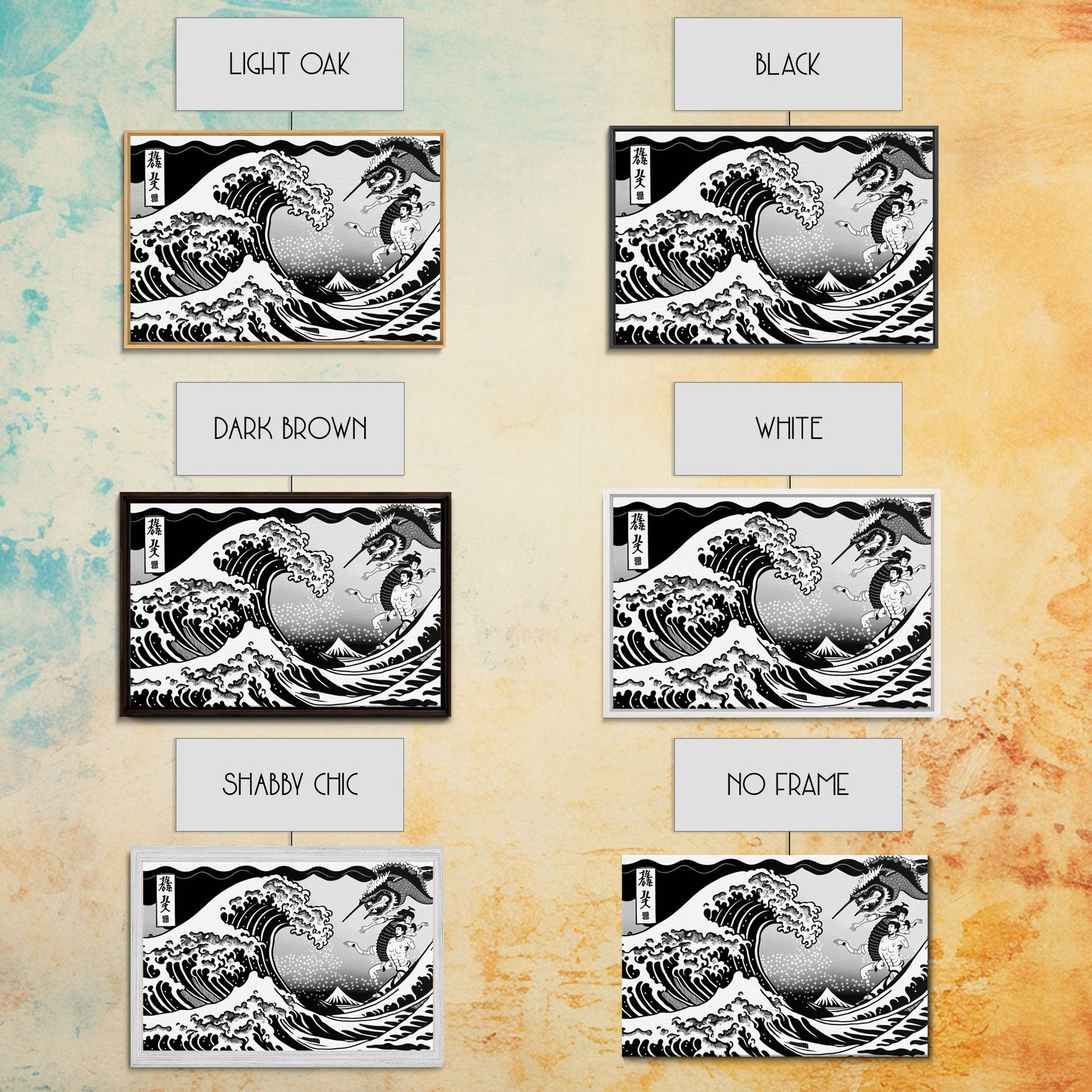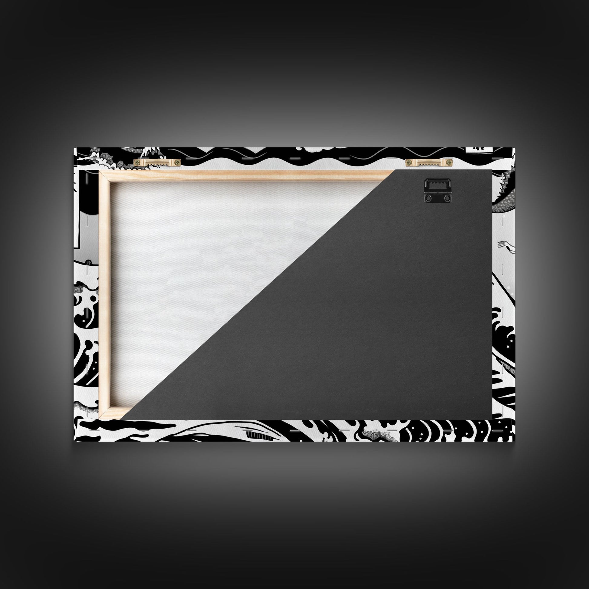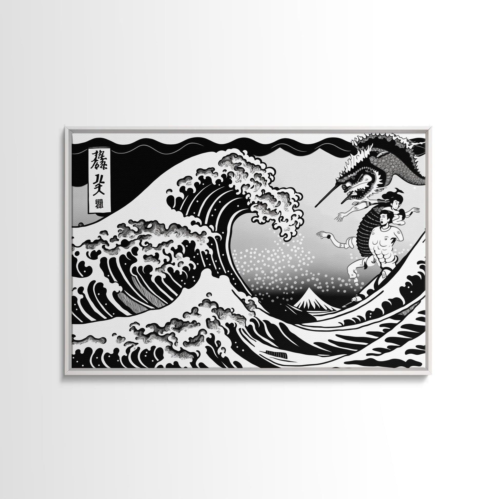 Beautiful Black and White Ocean Wave Wall art, Framed Canvas Print, Retro Japanese Inspired Hokusai Style Wave Art