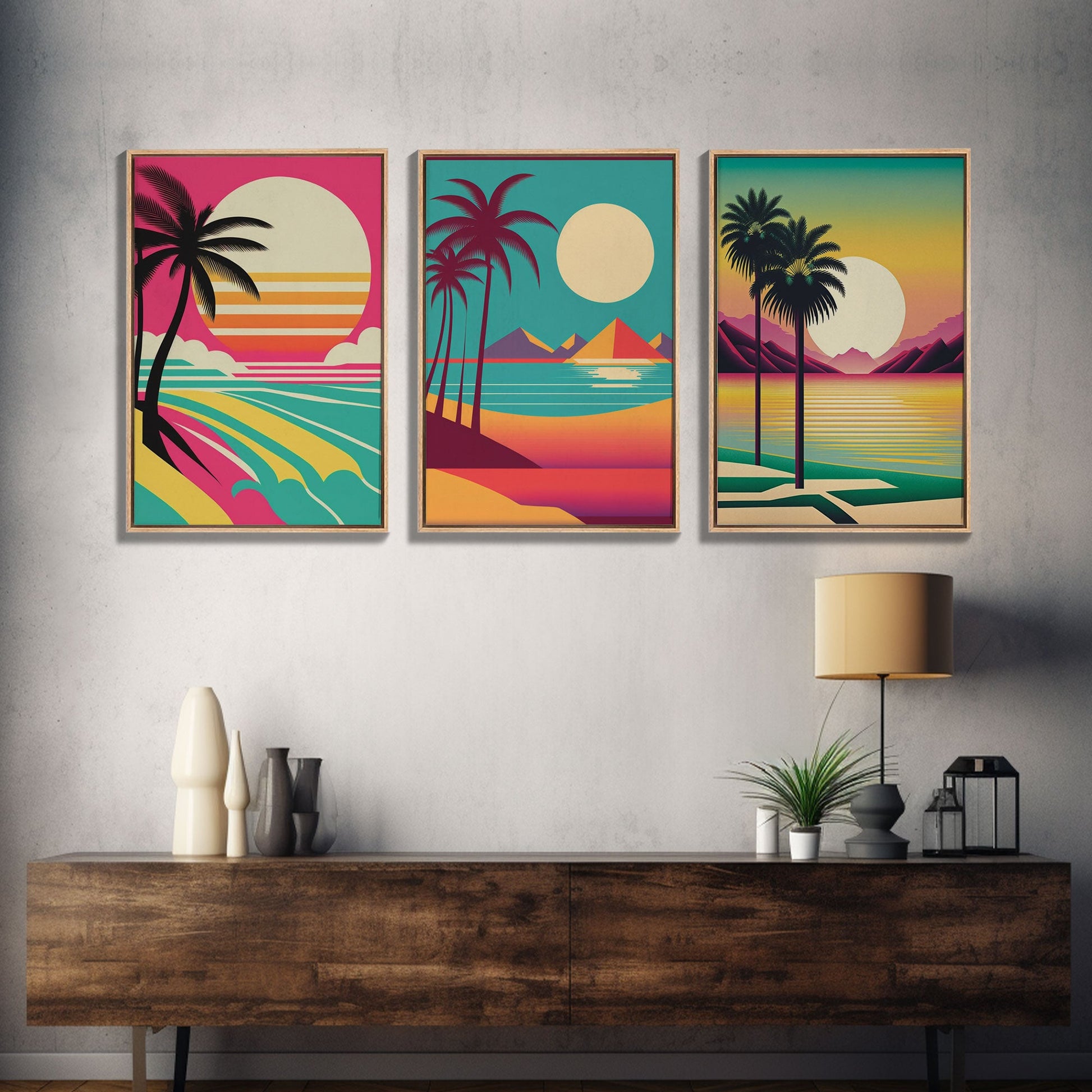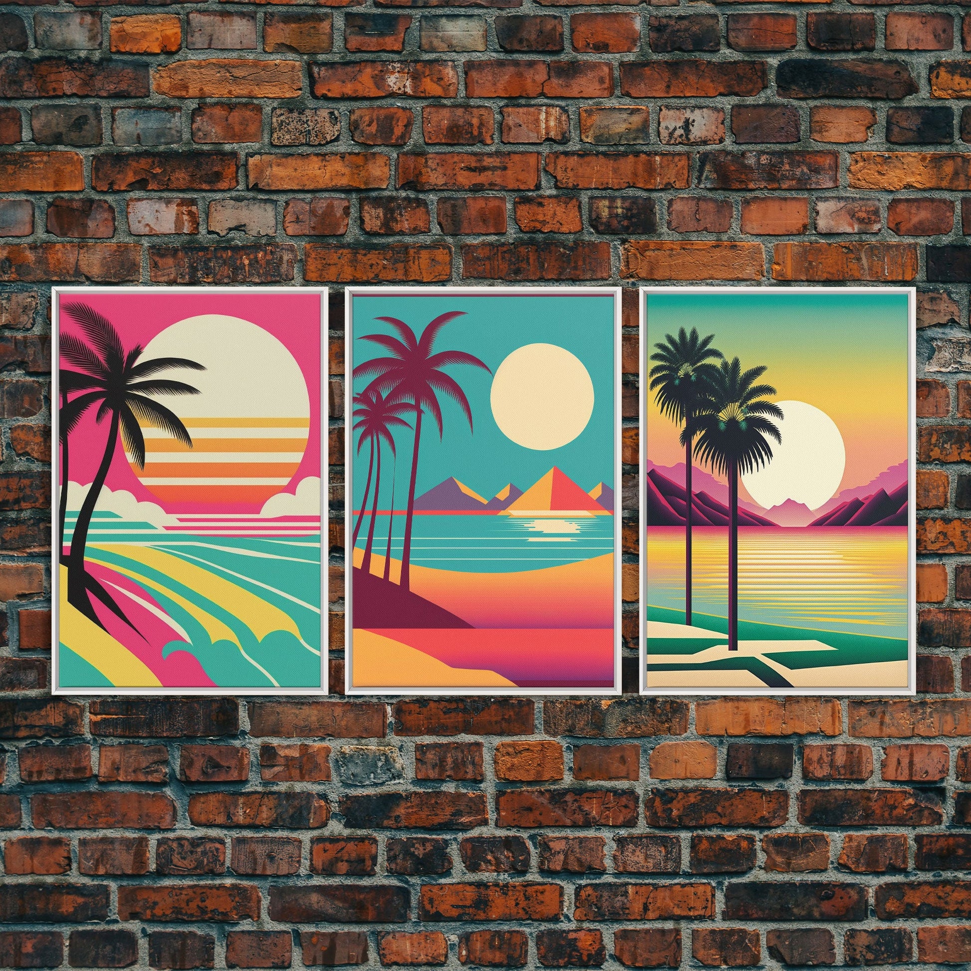 Beautiful Turquoise Retro Style Beach Art, Triptych 3 Panel Framed Canvas Prints, Palm Trees and Sunset, 80s Vibes Vaporwave Art Deco Mashup