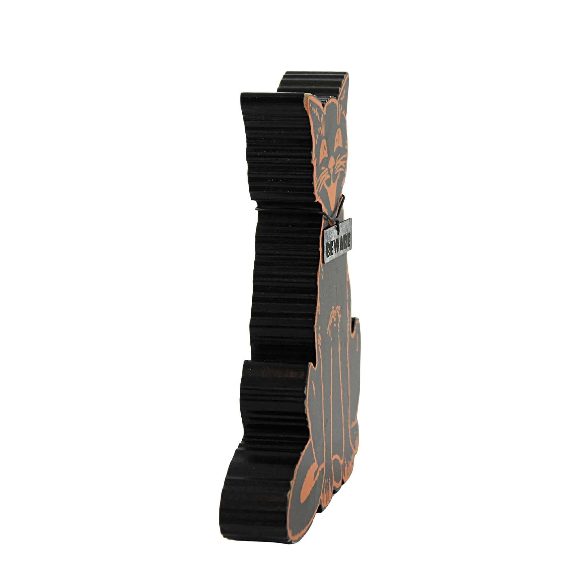 A retro-inspired wooden chunky sitter featuring a black and orange sitting cat design, and a metal plate with cut-out "Beware" sentiment. This vintage-inspired design is reminiscent of the older Beistle cardboard cut-outs from years past.