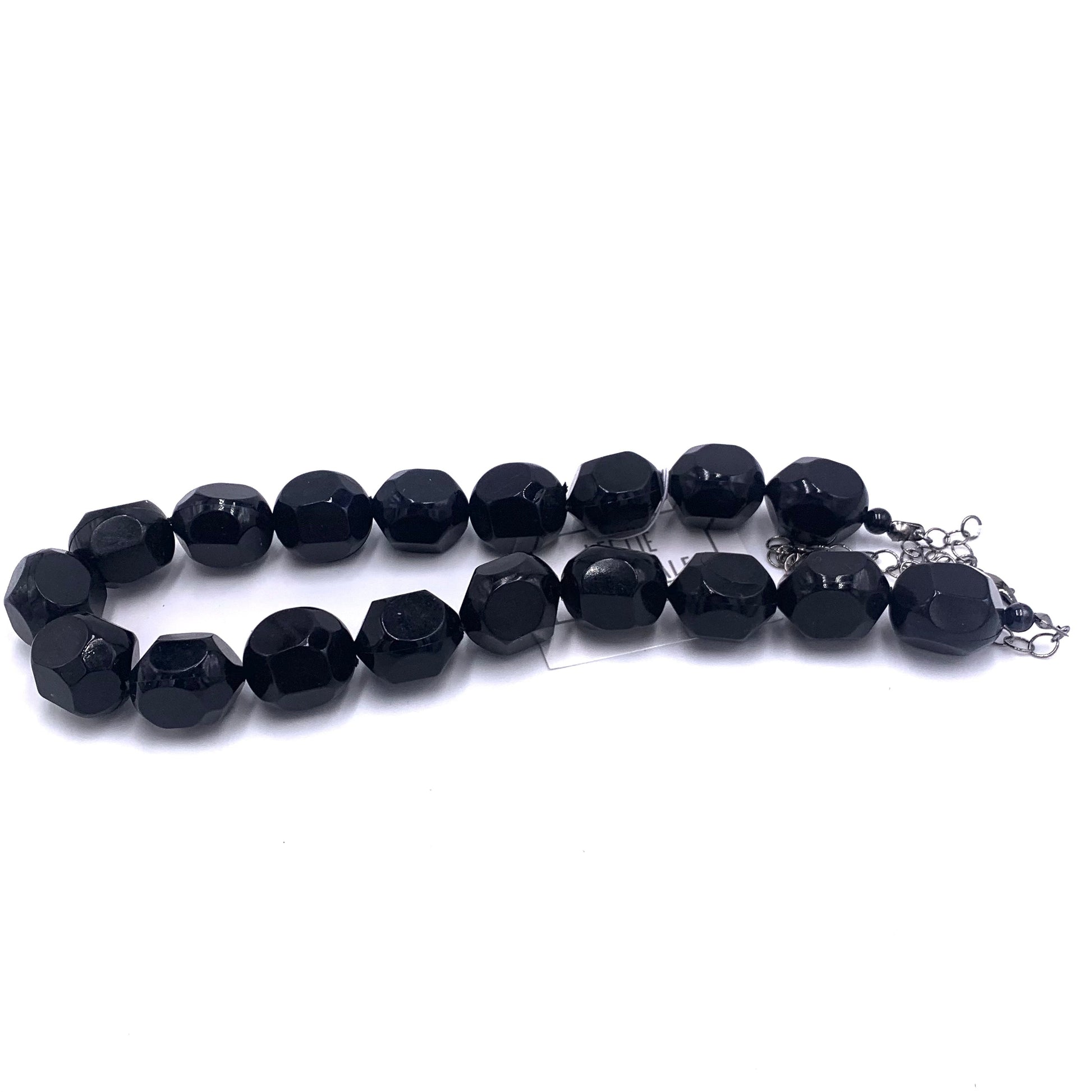 Jet black faceted & chunky bead necklace featuring vintage lucite beads in a shiny opaque finish. The beads are from the 1980's in a shiny opaque finish and are super light weight. Each necklace measures about 16" + a 6" extender. Finished with gold metal colored findings.