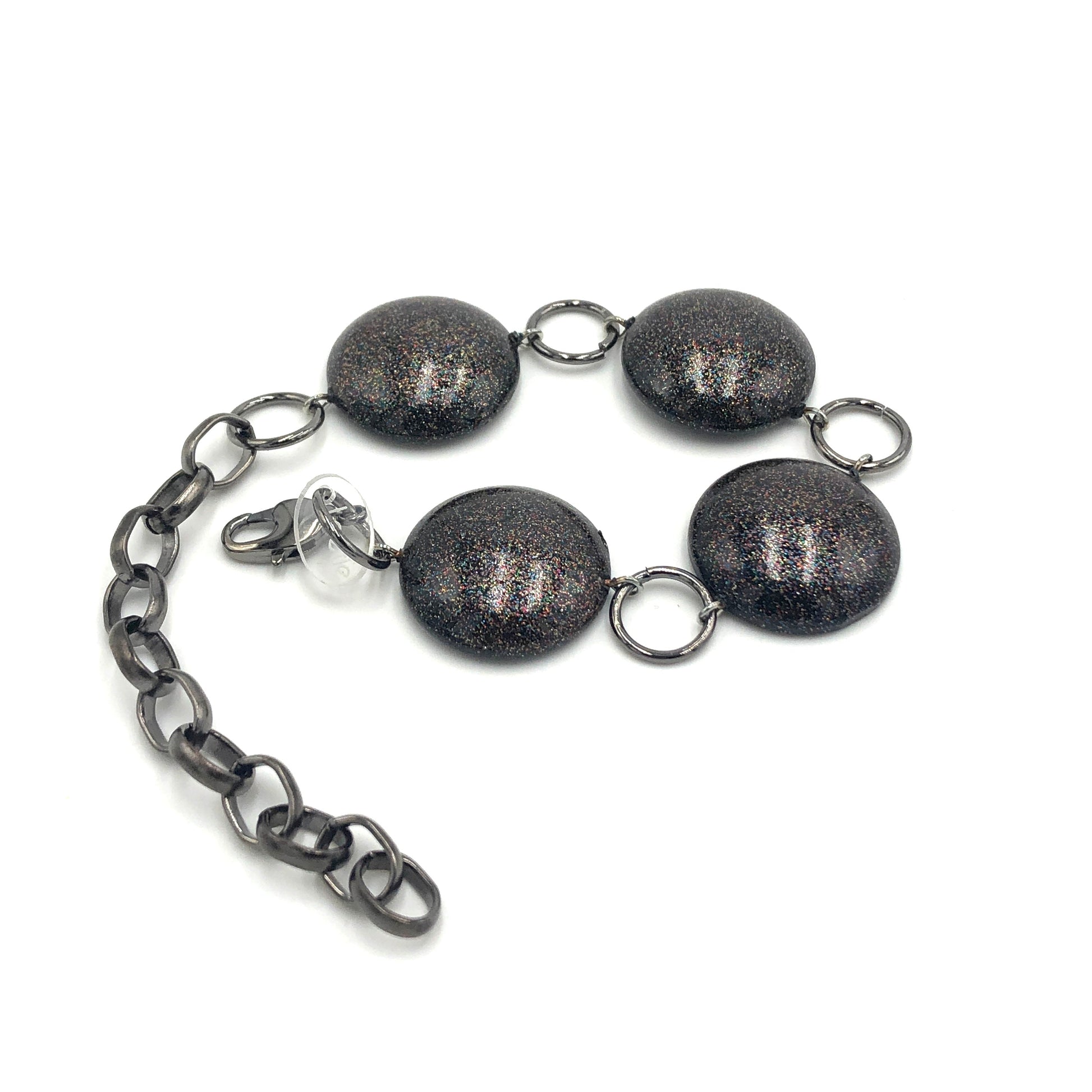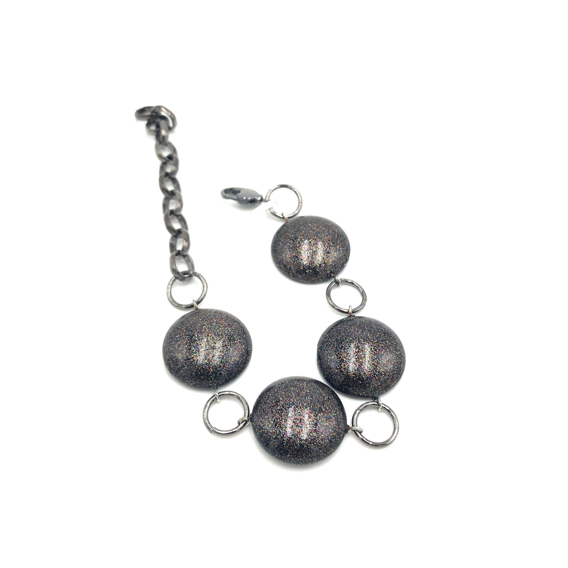 Black & glitter meet in this celestial bracelet. The Stations Bracelet is adjustable to 10". Enough of a statement to be worn on its own OR stack for an arm party with others. Lots of versatility from 6.5 to 10" and swivel lobster claw makes it so that you can latch a link all by yourself. Light weight with a chunky look.