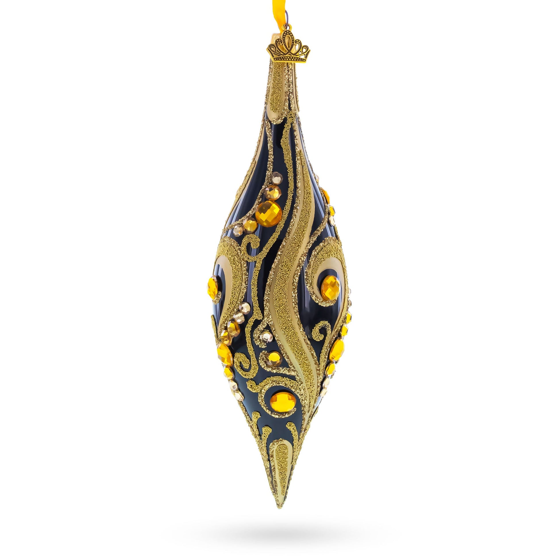 Black & Gold Jeweled Swirl Elongated Pointed Teardrop Finial Glass Christmas Ornament