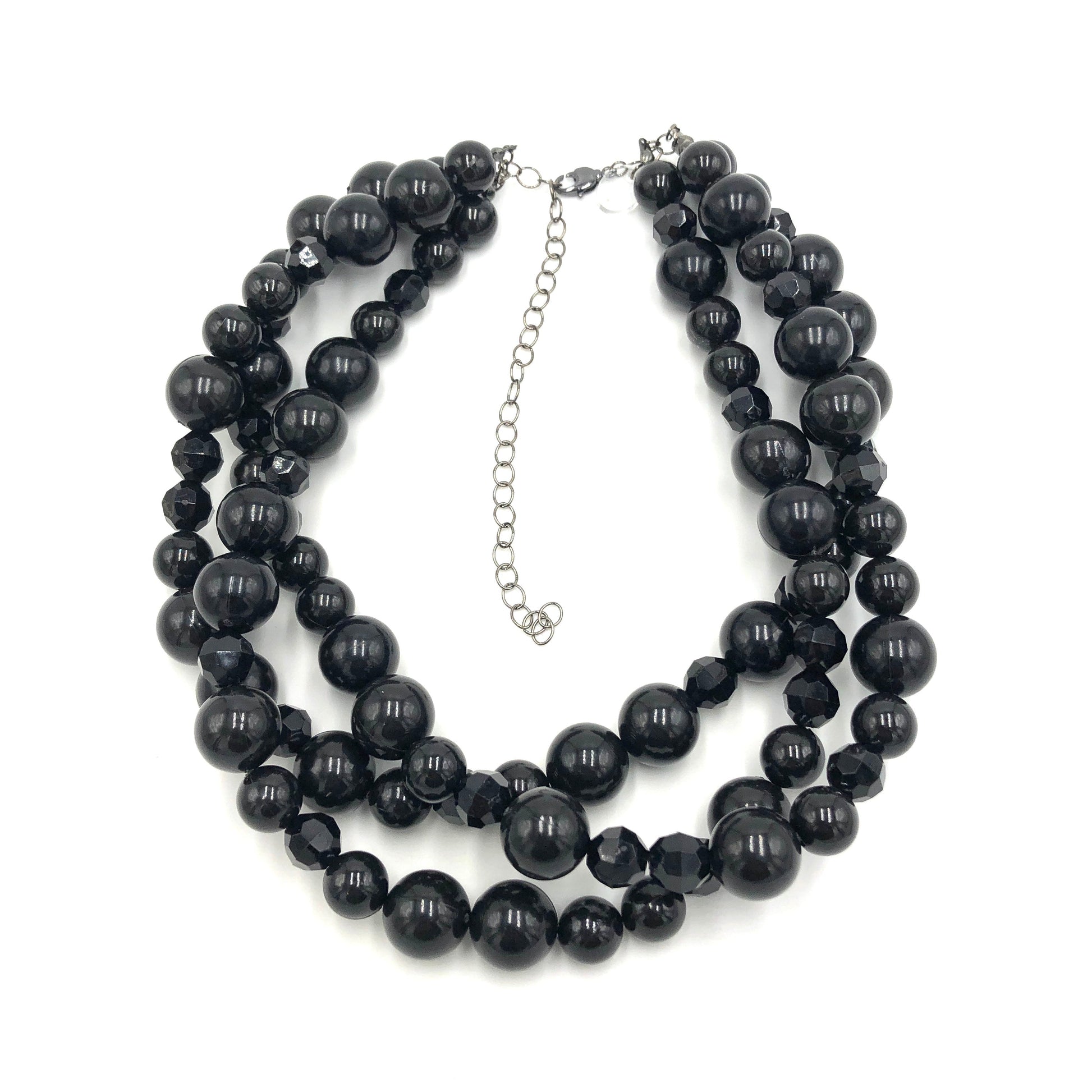 This exquisite yet timeless piece makes a statement with its three strands of glossy jet black beads. Known as the Morgan Necklace, this piece was crafted from beads from the 1960's. Measuring 15.5-16" with a 6" extender, it's lightweight and comfortable to wear. Perfect for those who desire a classic style that will never go out of style.