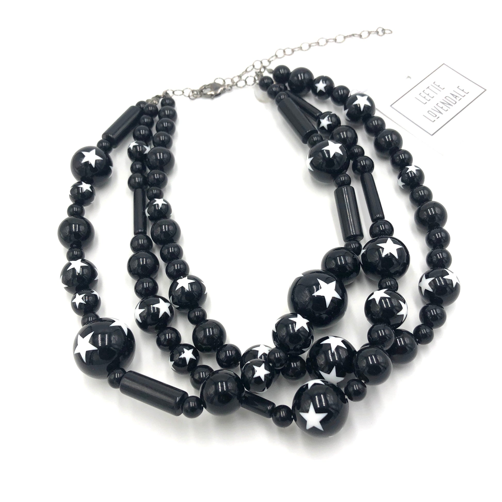 Rare & vintage white and black star beads in a mixed shape pattern make up this retro-beautiful statement necklace. This 3 strand statement necklace style is known as the Morgan Necklace. Beads were made in the 1960's. Necklace measures 15.5-16" at it's shortest + a 6" extender. Lightweight and fun to wear: a classic style that will outlast trends. Model is wearing the same style in another color-way so you can see this piece styled when worn.