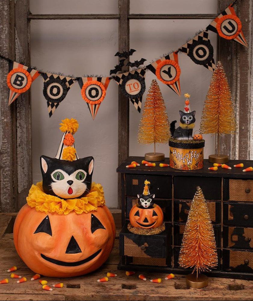 This black kitten is standing on top of a box completely wrapped with a vintage inspired Halloween image. He is sitting on the side of a pumpkin bucket and wearing a party hat with paper poms. Cecil has a yellow mesh collar and a black chenille tail. This versatile piece not only adds a touch of festive flair to your décor but also serves as a charming container.