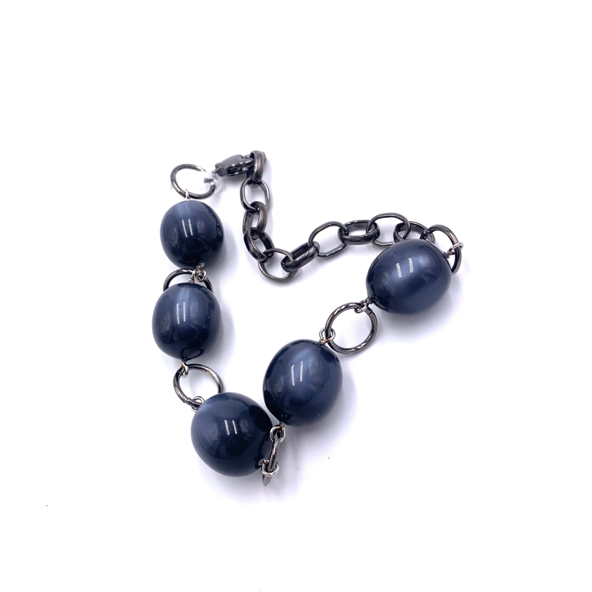 Lucite stations bracelet featuring charcoal grey in a moonglow finish & in oval-beaded links shape, and gritty gun metal chain. The Stations Bracelet is adjustable to 10". Enough of a statement to be worn on it's own OR stack for an arm party with others. Lots of versatility from 6.5 to 10" and swivel lobster claw makes it so that you can latch a link all by yourself. Light weight with a chunky look.