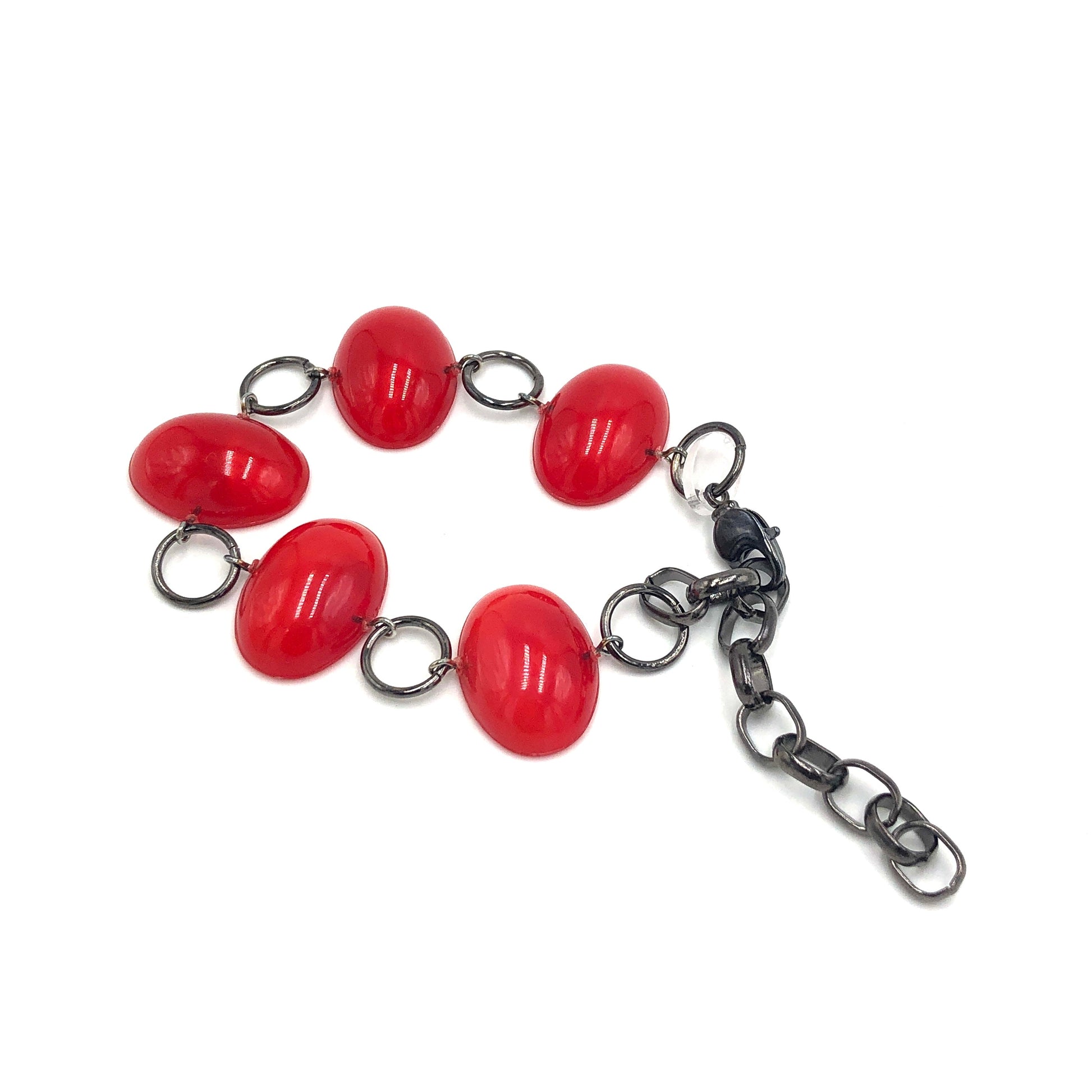 Lucite stations bracelet featuring cherry red aura glow oval shapes & links in your choice of gritty gun metal or frosted gold links and chain. The Stations Bracelet is adjustable from 6 to 10". Enough of a statement to be worn on its own OR stack for an arm party with others. Lots of versatility and the swivel lobster claw makes it so that you can latch a link all by yourself. Light weight with a chunky look.