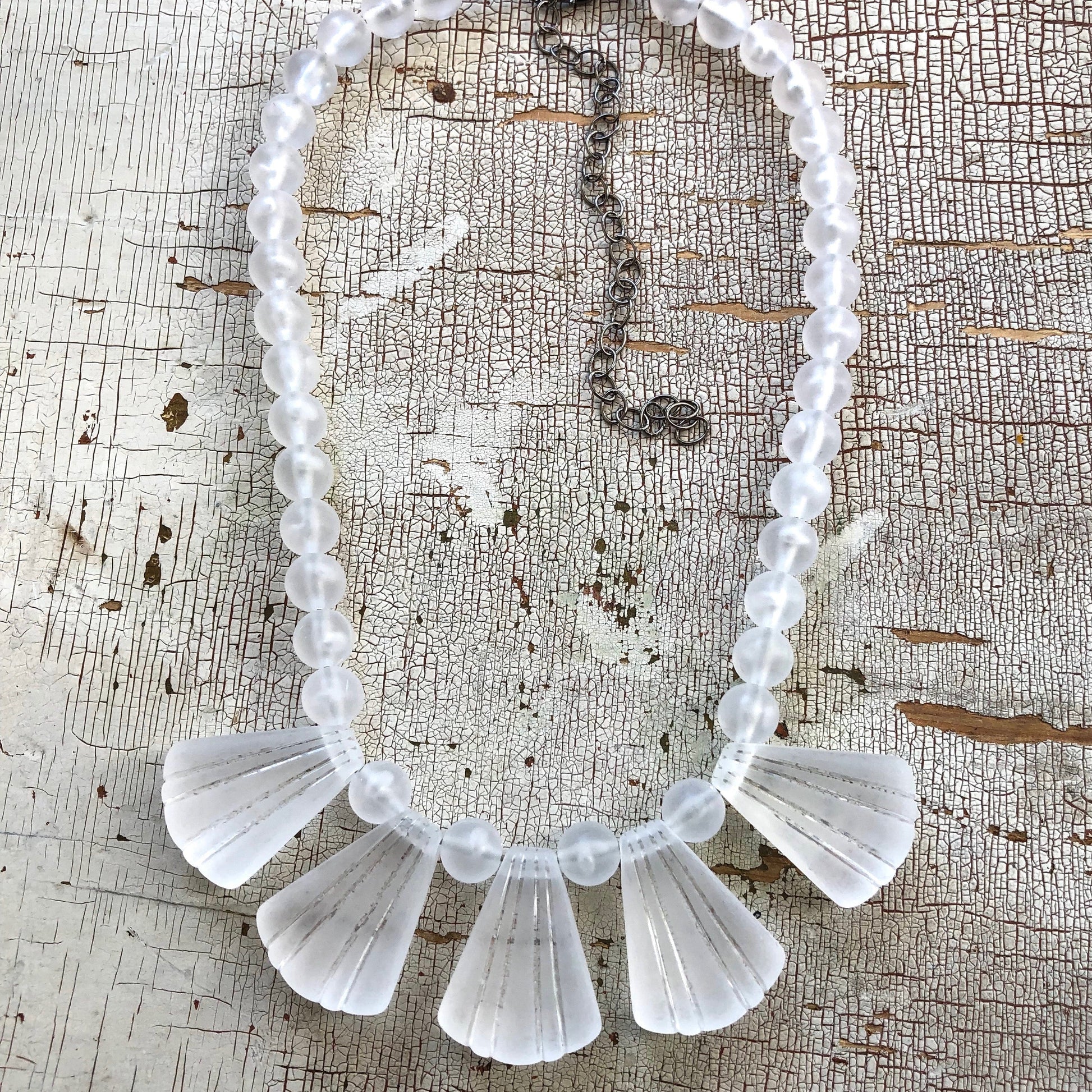 Clear frosted necklace featuring vintage lucite Art Deco pendant style beads in a froted finish. The beads are from the 1970's and are super light weight. Each necklace measures about 16-17" + a 6" extender. Finished with gun metal dark findings.