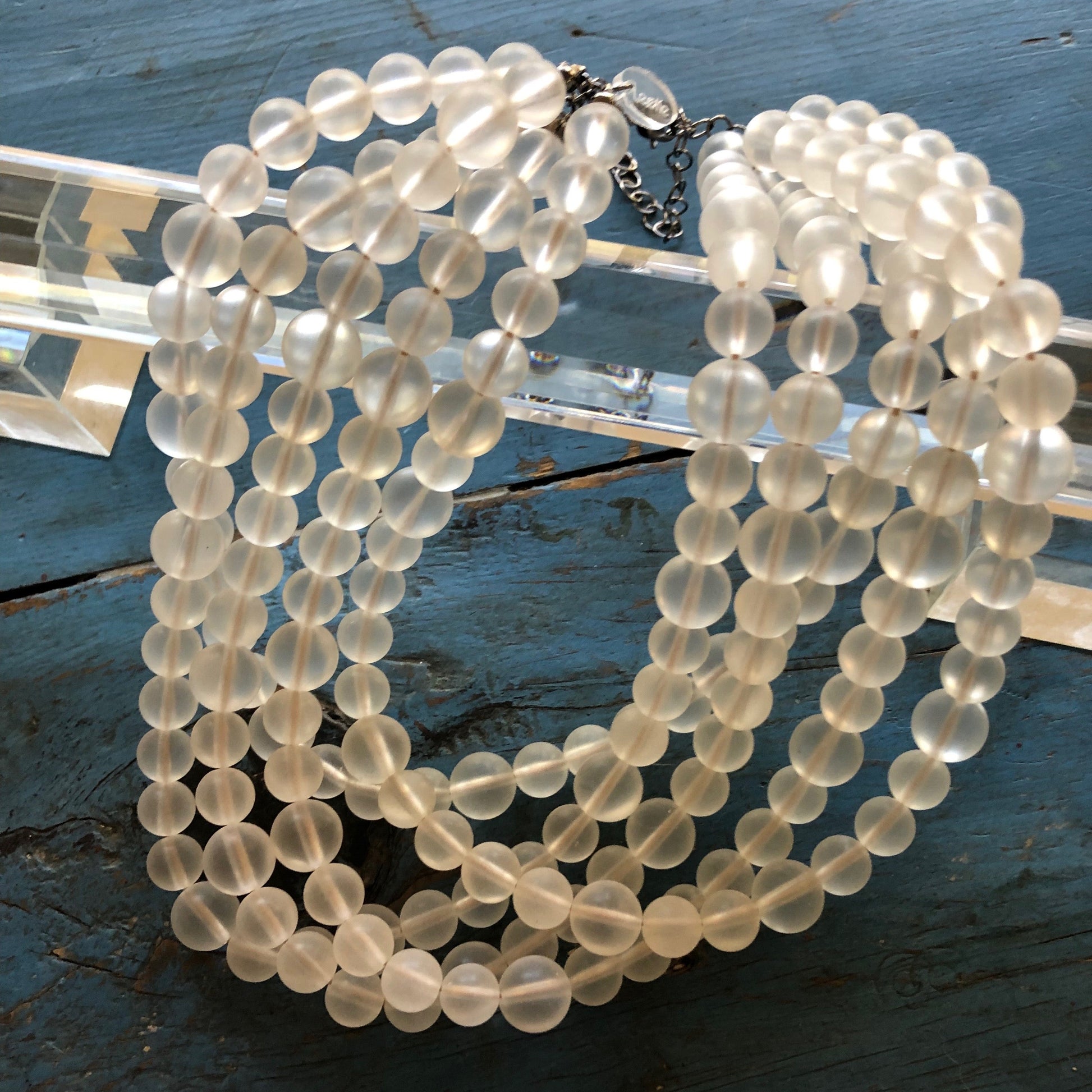Frosted clear variegated sized round beads are chunked up and fabulous in this beaded necklace featuring 5 strands of lightweight vintage lucite beads. This statement necklace style is known as the Sylvie Necklace. Beads are frosted finish in that great retro look & they were made in the 1960's. Necklace measures 15.5-16" at it's shortest + a 6" extender. Lightweight and fun to wear: a classic style that will outlast trends.