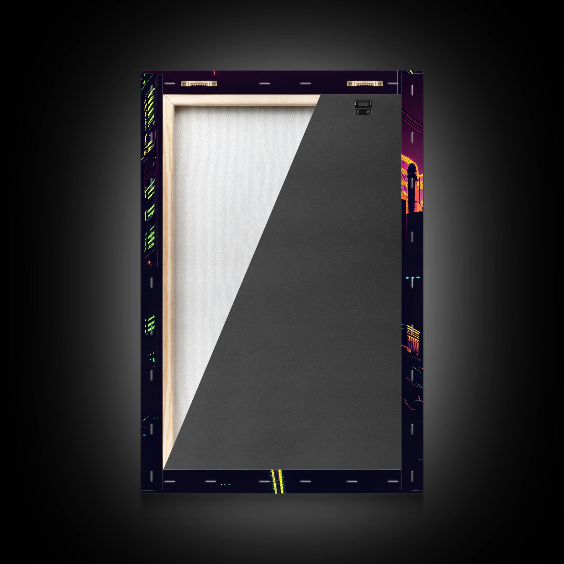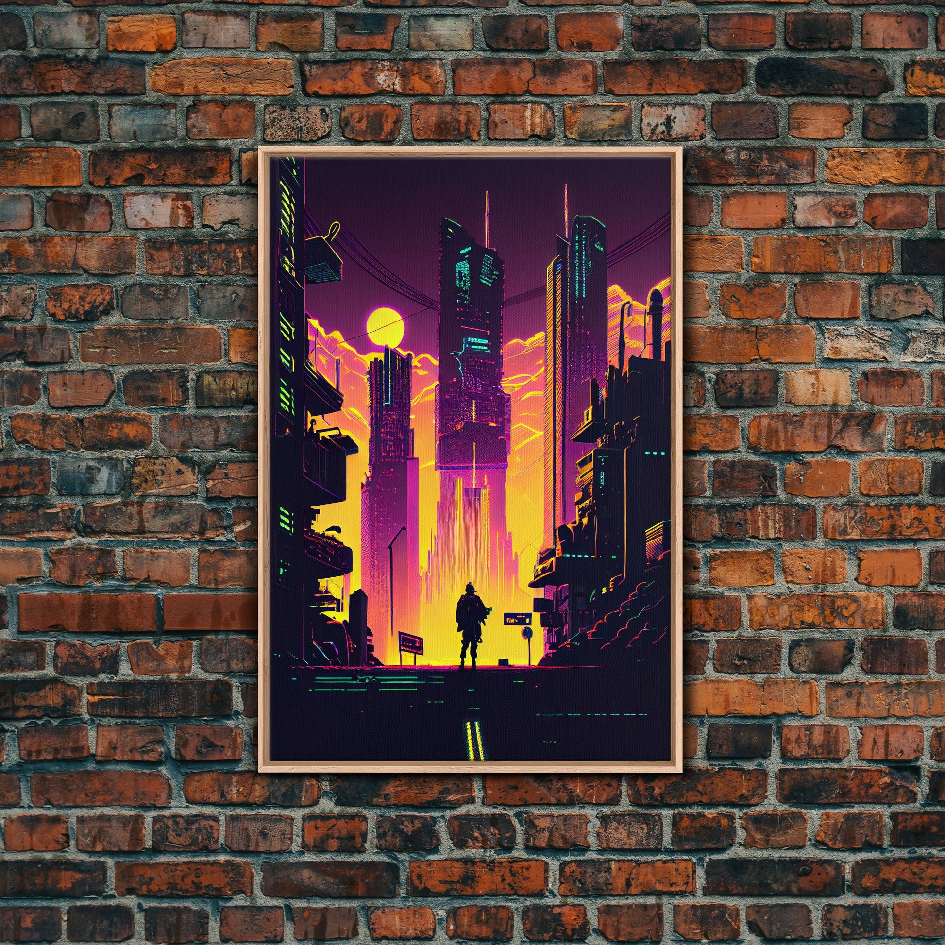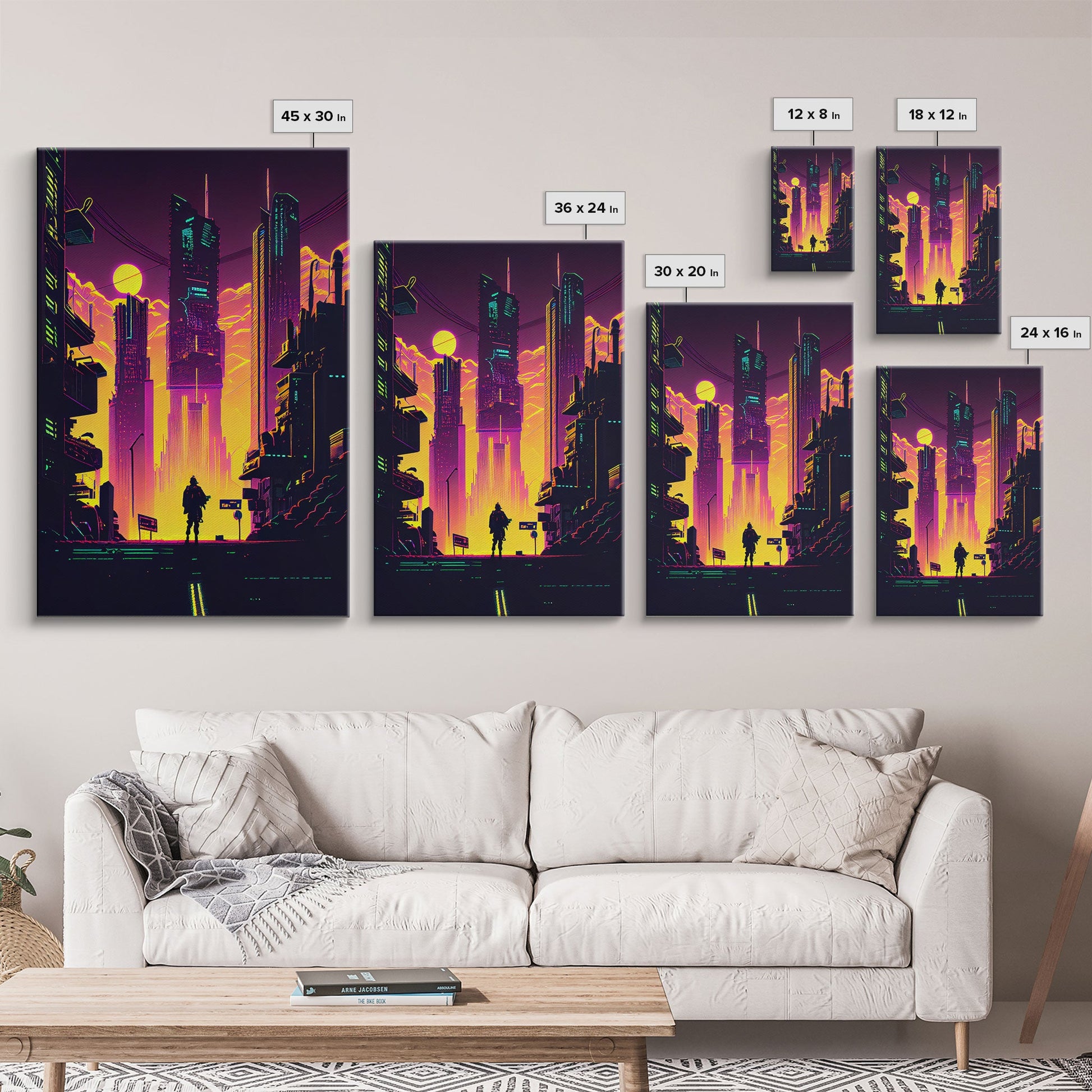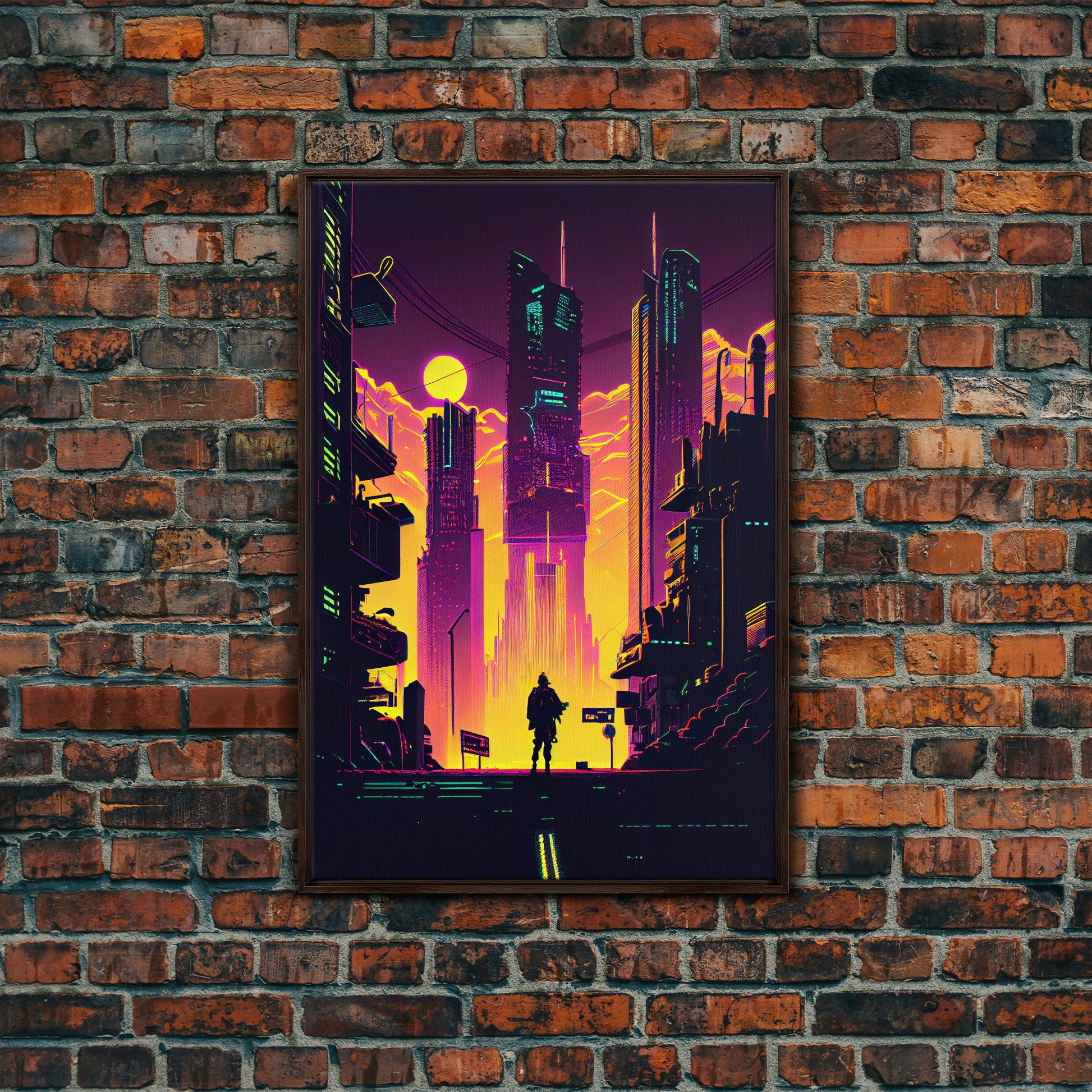 Cyberpunk art, Retrowave style dystopian cityscape art, game room art, framed canvas print, retro wave city skyline