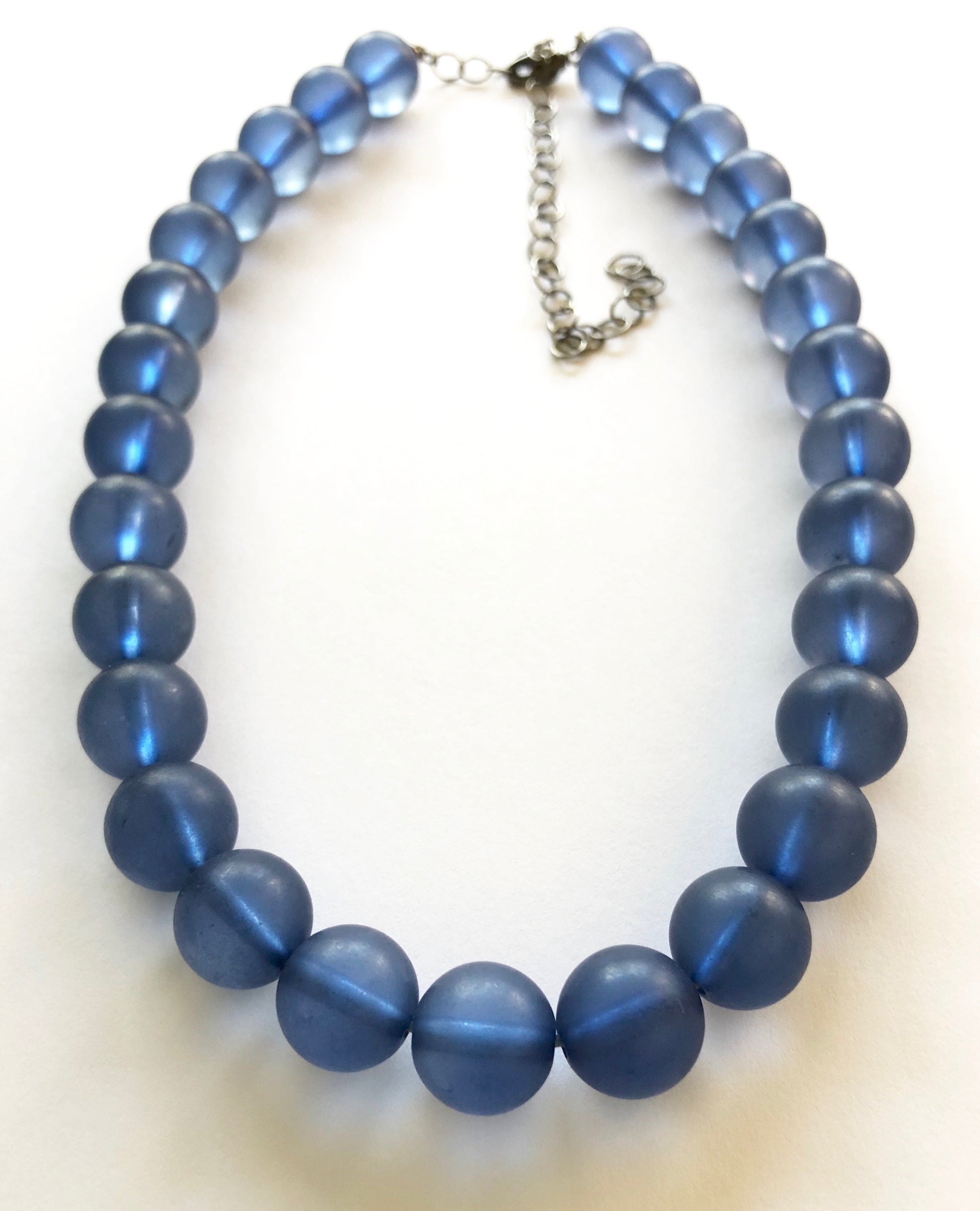 Denim blue beaded necklace featuring vintage lucite beads in a frosted finish. Nice & chunky beads, each measure about 17mm in diameter. The beads are from the 1980's and are super light weight. Each necklace measures about 16" + a 6" extender. Finished with gold metal colored findings.