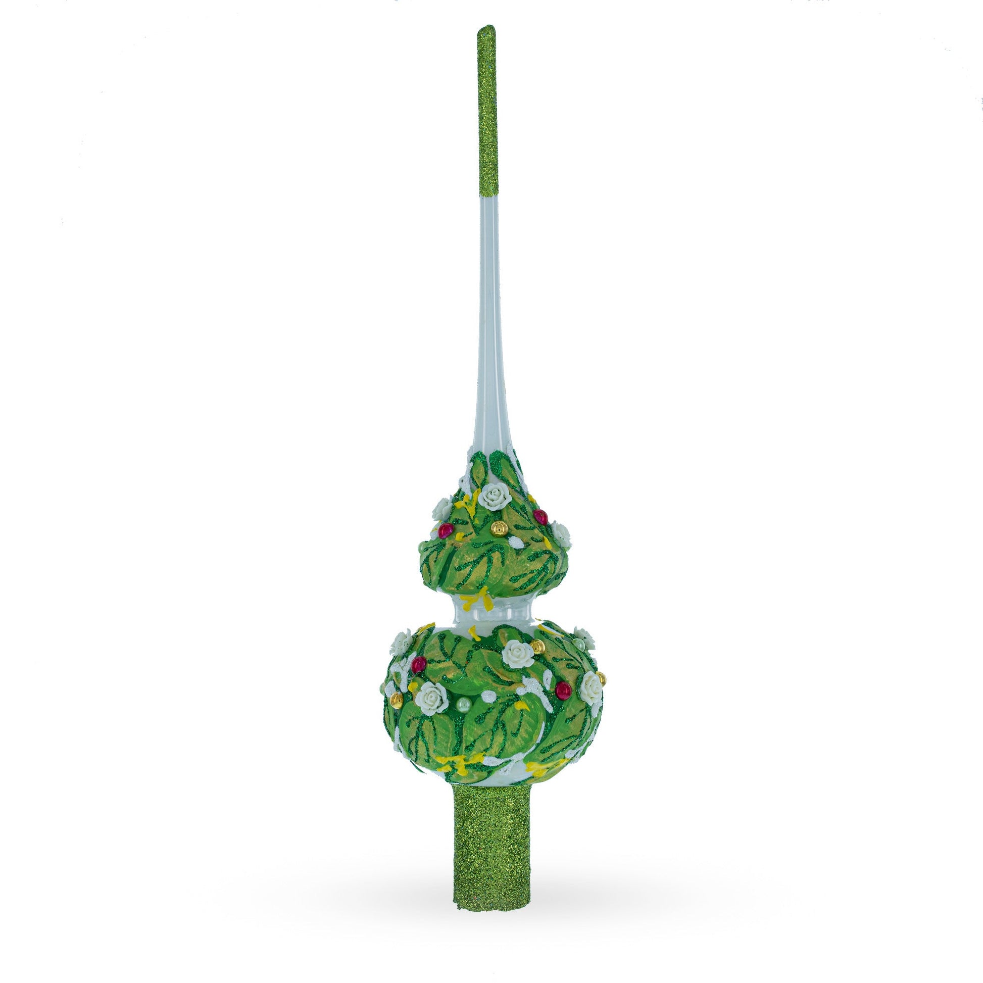 Dimensional White Roses on Green Leaves Glass Christmas Tree Topper 11 Inches