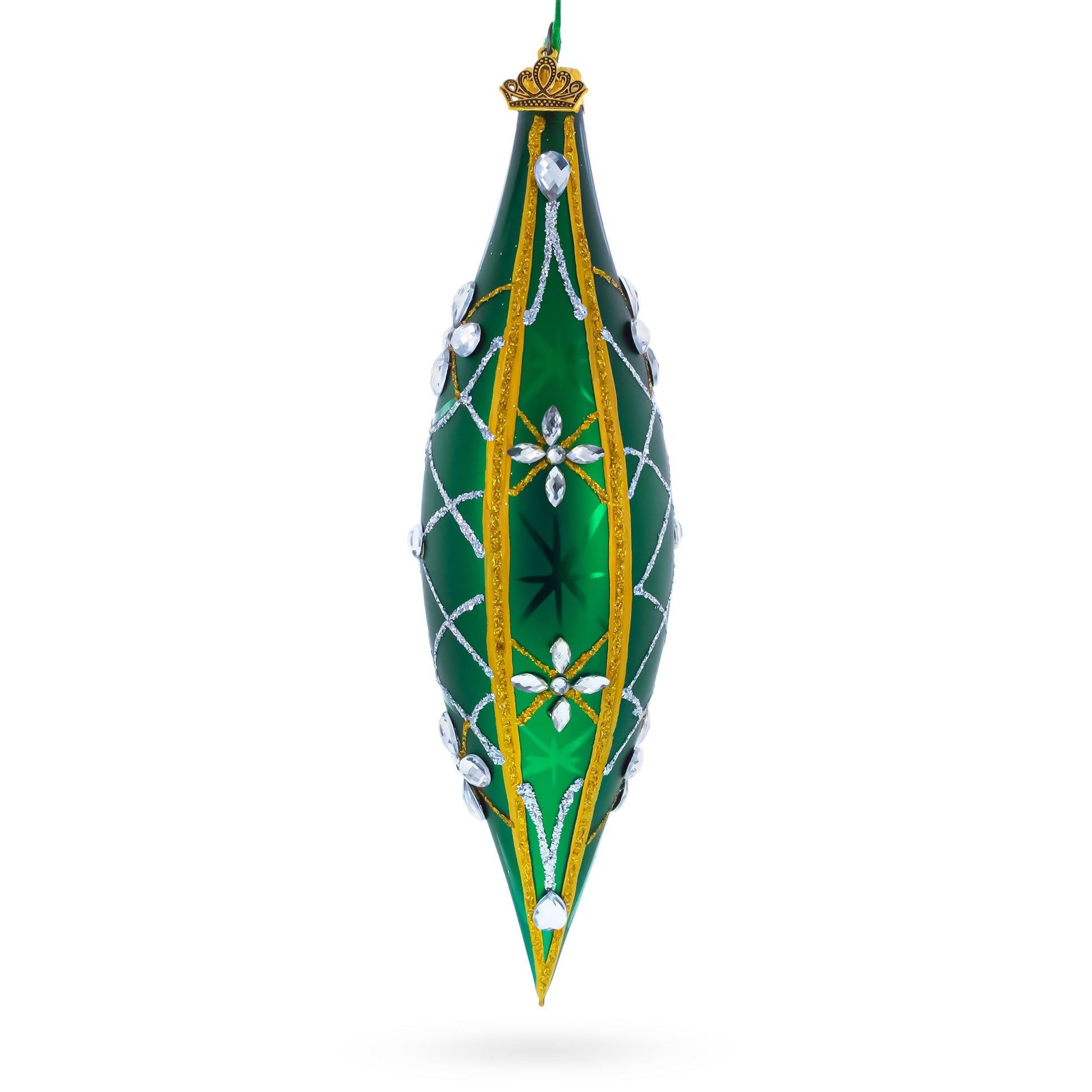 Emerald Jeweled Lattice Elongated Pointed Teardrop Finial Glass Christmas Ornament