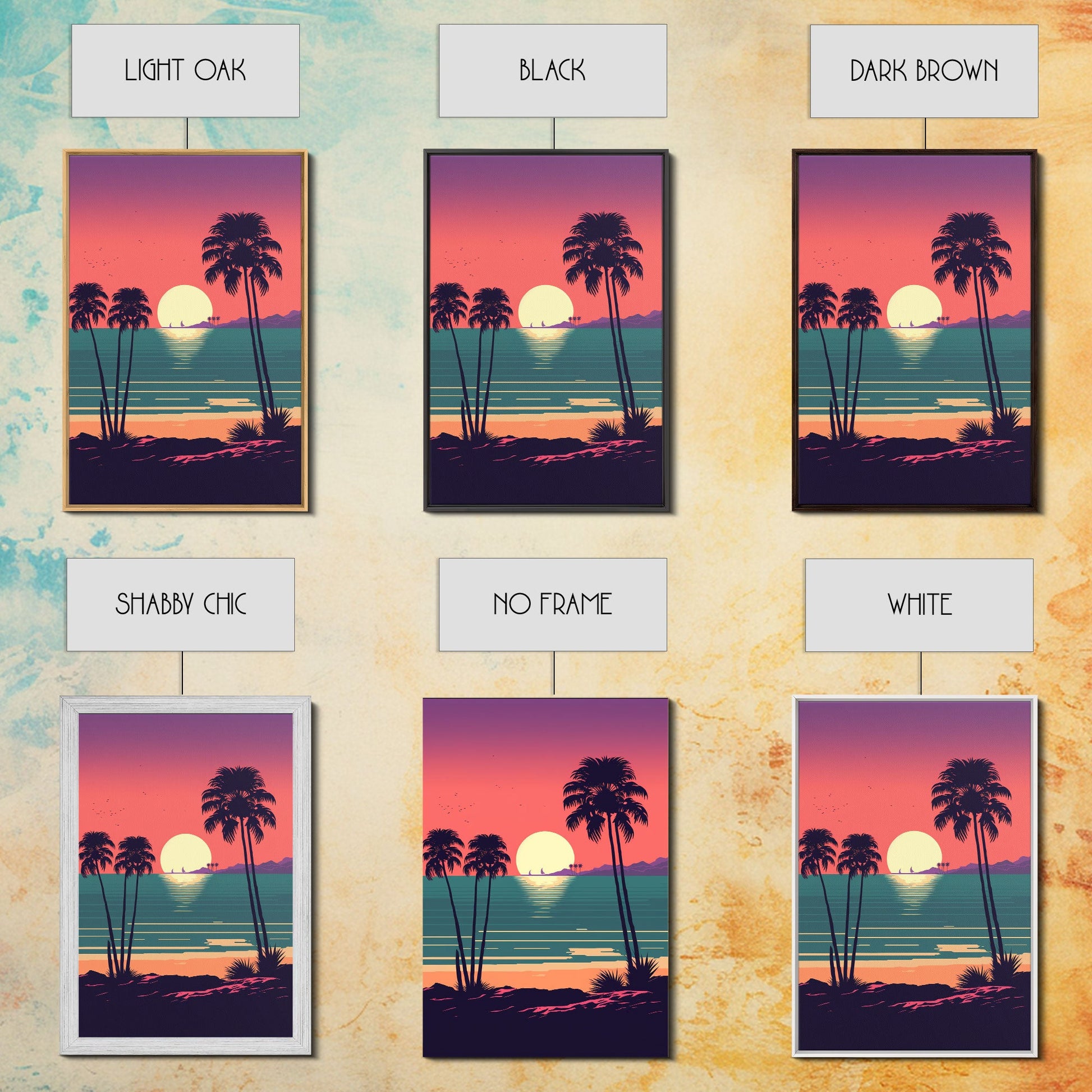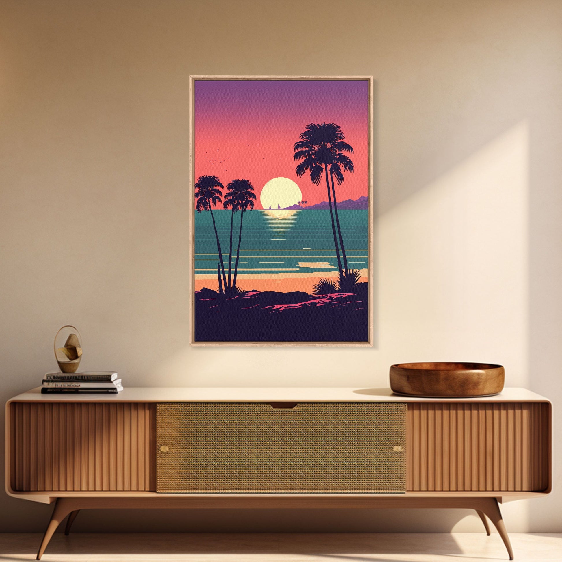 Framed Canvas Print - Art Deco Sunset, Palm Trees, Synthwave Vibes, Beach Decor, Vaporwave Pink Art, Miami Vibes