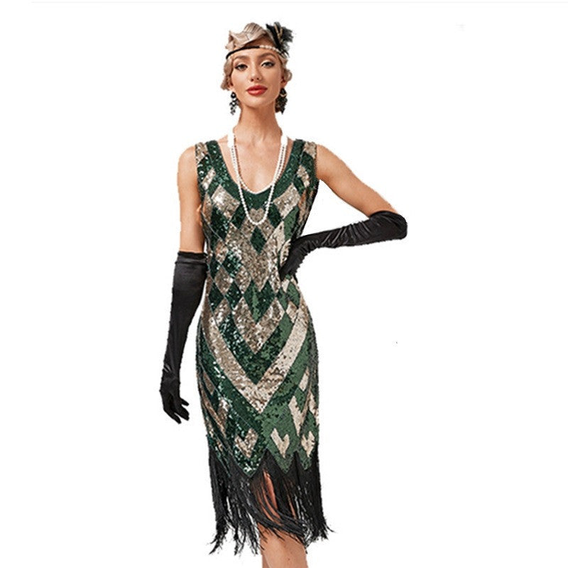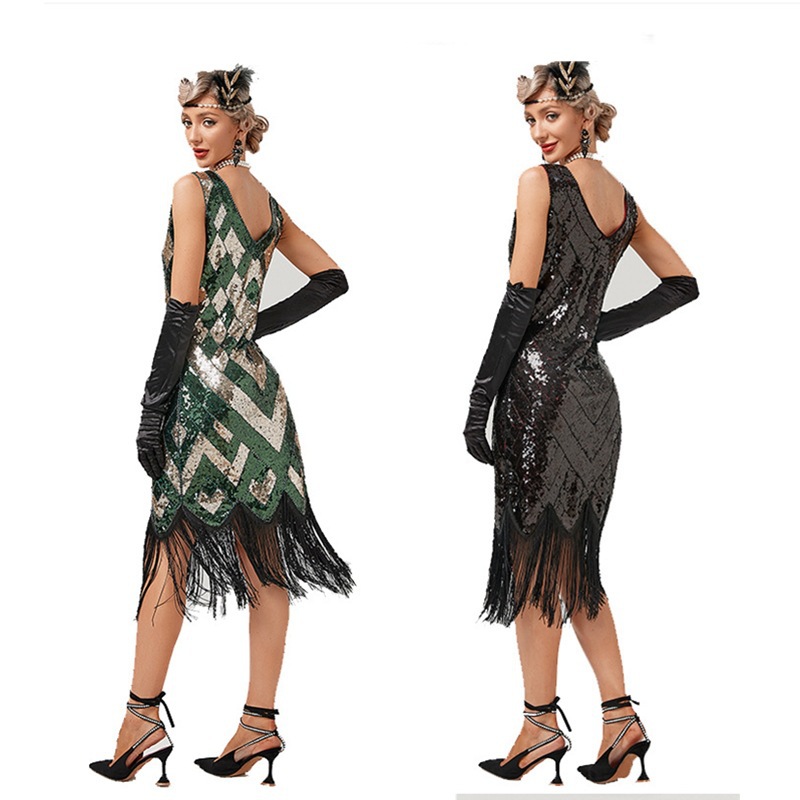 Gatsby Sequin Fringe Dress 1920s Vintage V-Neck Elegant Evening Gown Sexy Fringed Dress