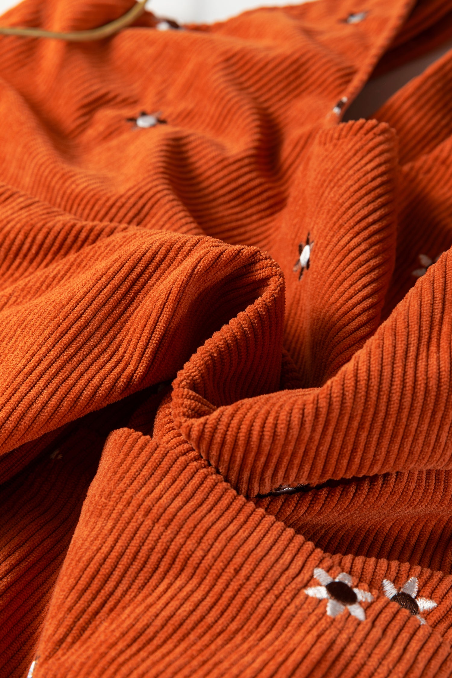 Flower embroidery adds delicate botanical charm to this corduroy overall dress.