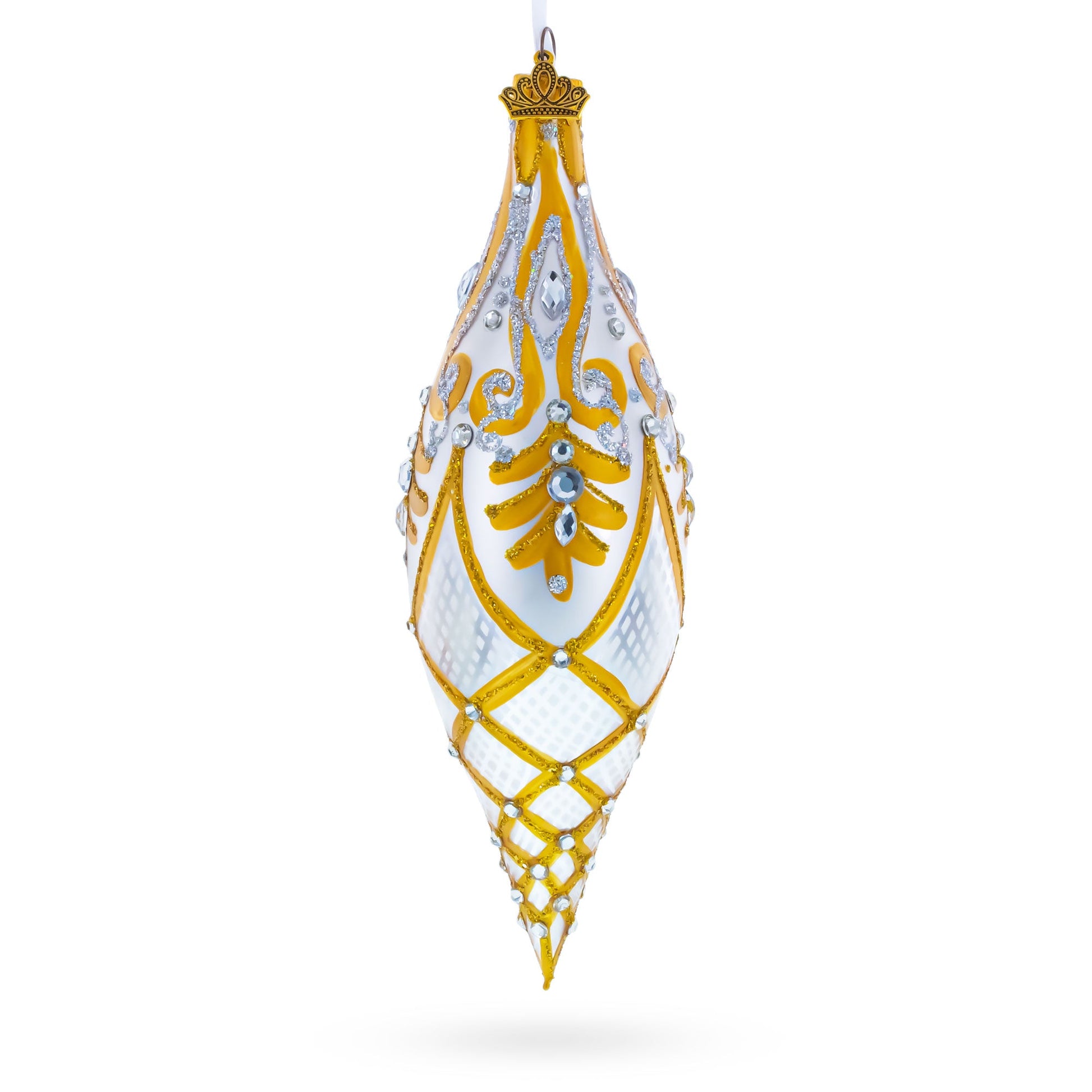 Gold & White Baroque-Style Gem-Encrusted Elongated Pointed Teardrop Finial Glass Christmas Ornament