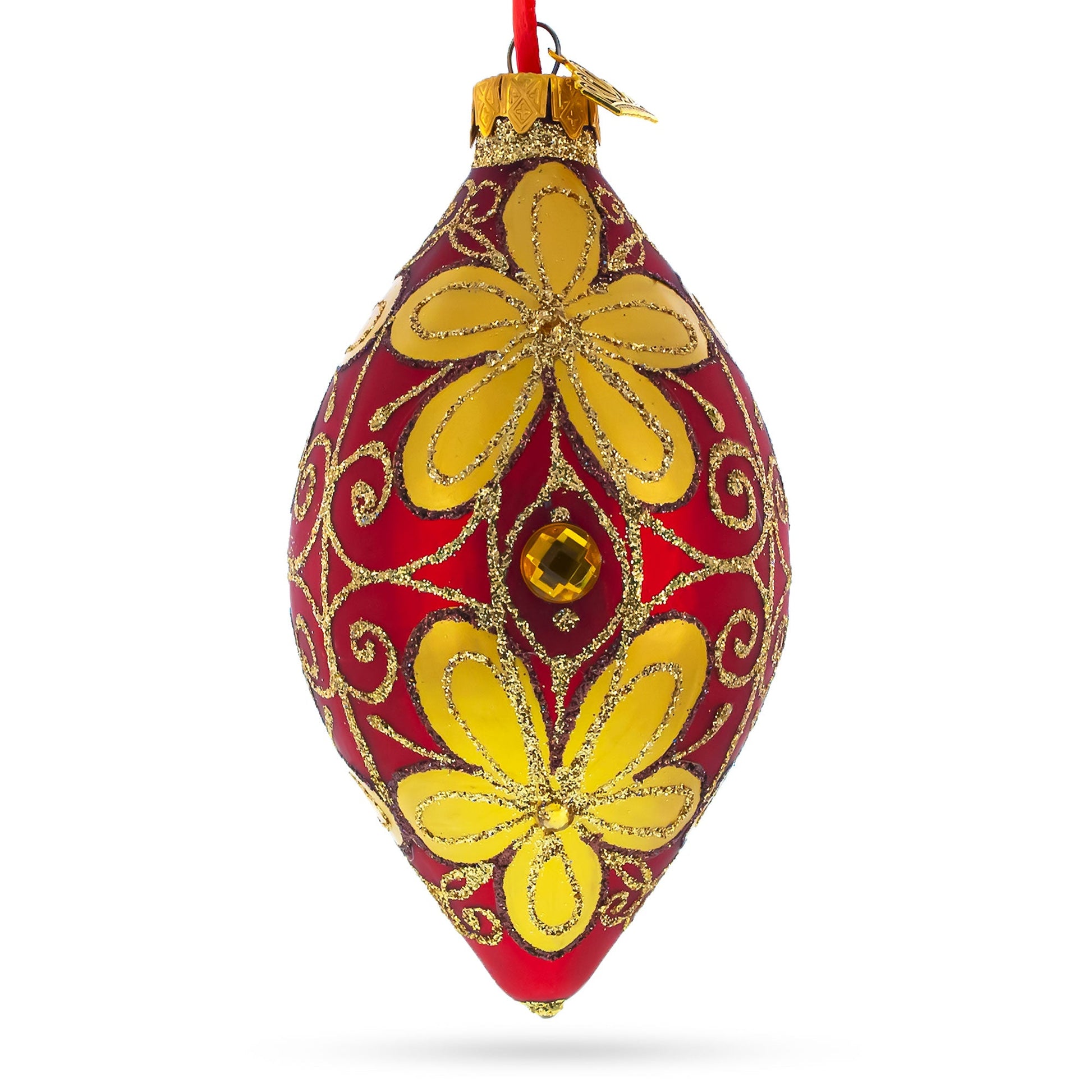 Golden Flowers Pointed Teardrop Finial Glass Christmas Ornament