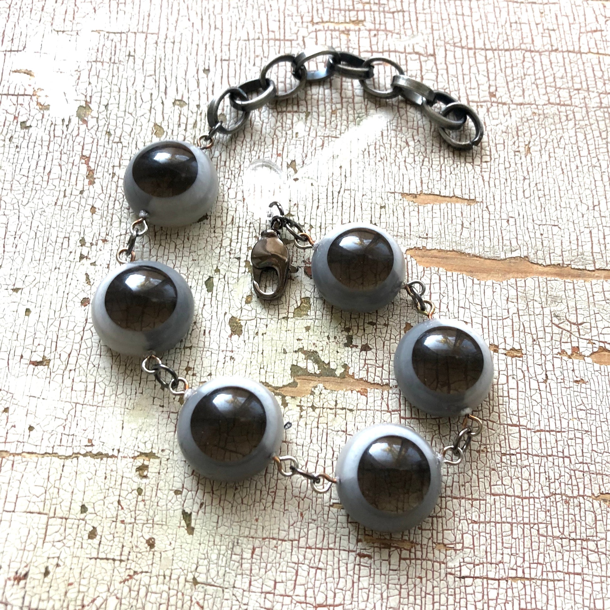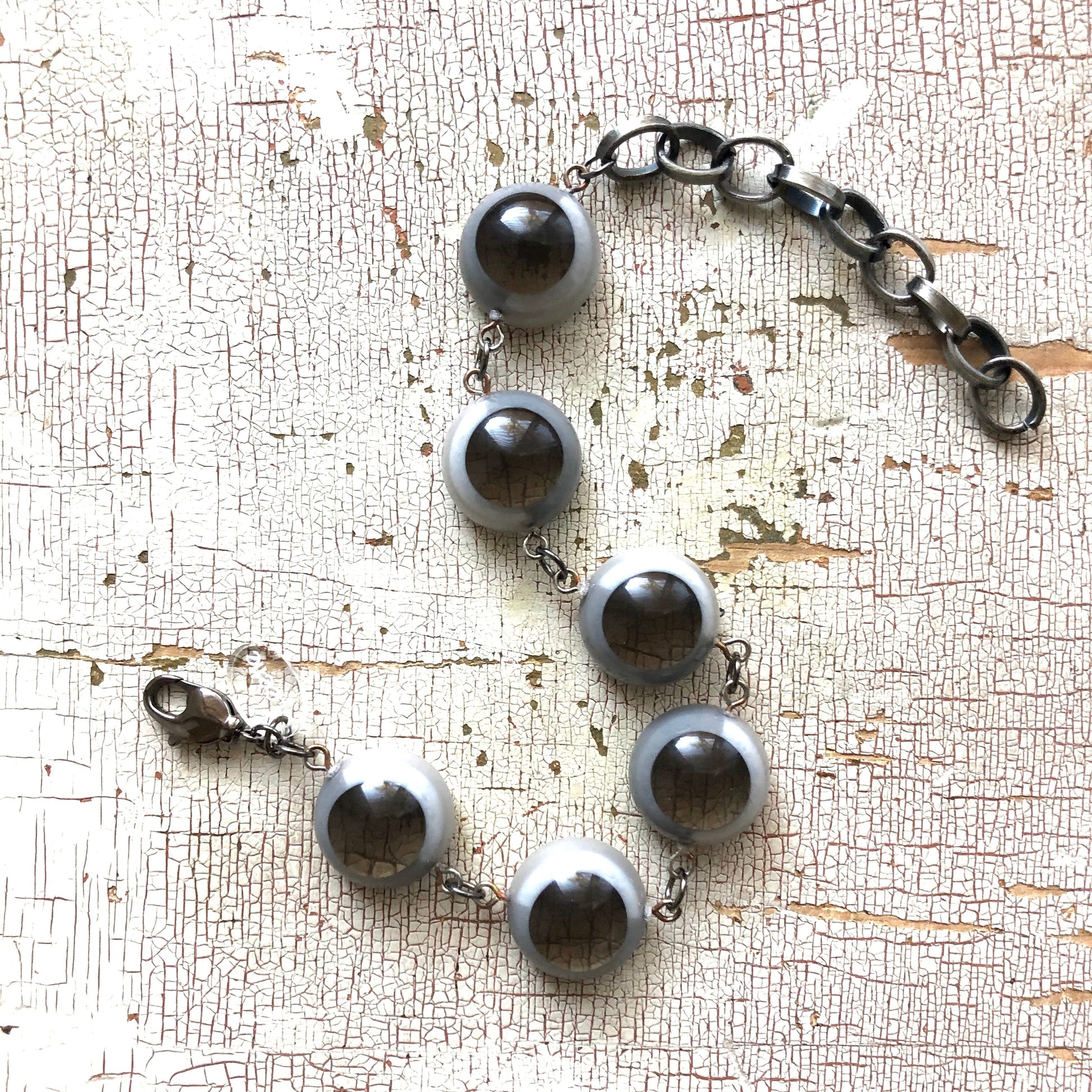 Grey transparent with blocks of grey in lights & darks in the shape of rounded flat backs, meet gritty gun metal chain in this adjustable to 8.5" Stations Bracelet. Enough of a statement to be worn on it's own OR stack for an arm party with others. Lots of versatility from 6.5 to 8.5" and swivel lobster claw makes it so that you can latch a link all by yourself. Light weight with a chunky look.