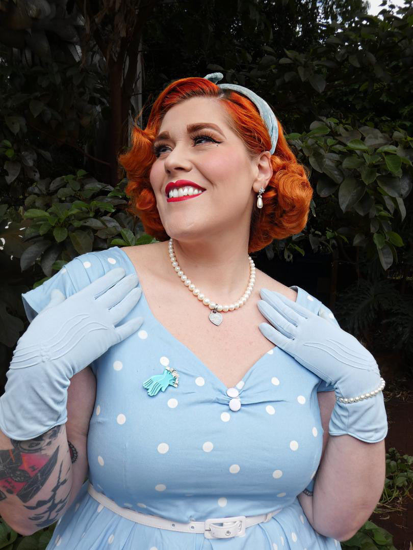 Channel your inner socialite with this "High Society Hands" brooch by Asia Ellington, brought to life by Lipstick & Chrome! This delightful mini brooch features a laser-cut acrylic resin illustration of a sophisticated pair of ladies' gloves. Engraved and painted with a pearl detail, they'll add a touch of vintage elegance and playful charm to any outfit, whether you're sipping tea at the Ritz or rocking a poodle skirt at the soda shop. Pin it to your favorite dress, add some panache to your purse, or elevate your everyday denim jacket.
