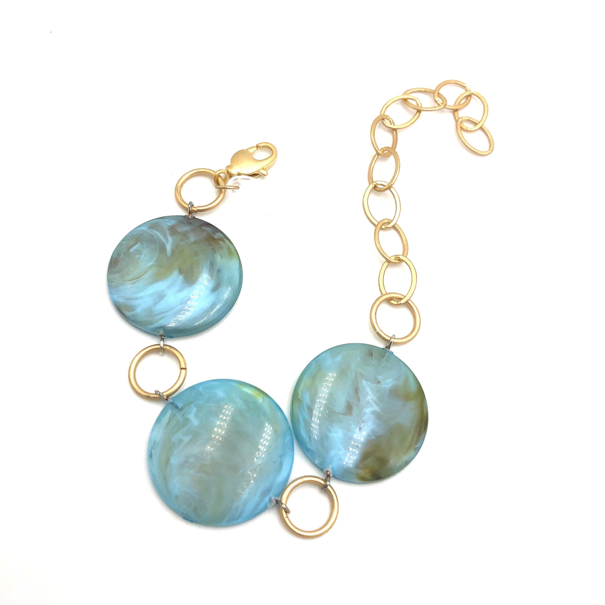Lucite stations bracelet featuring ice blue marbled baroque disc shapes & links in your choice of gritty gun metal or frosted gold links and chain. The Stations Bracelet is adjustable from 6 to 10". Enough of a statement to be worn on its own OR stack for an arm party with others. Lots of versatility and the swivel lobster claw makes it so that you can latch a link all by yourself. Light weight with a chunky look.