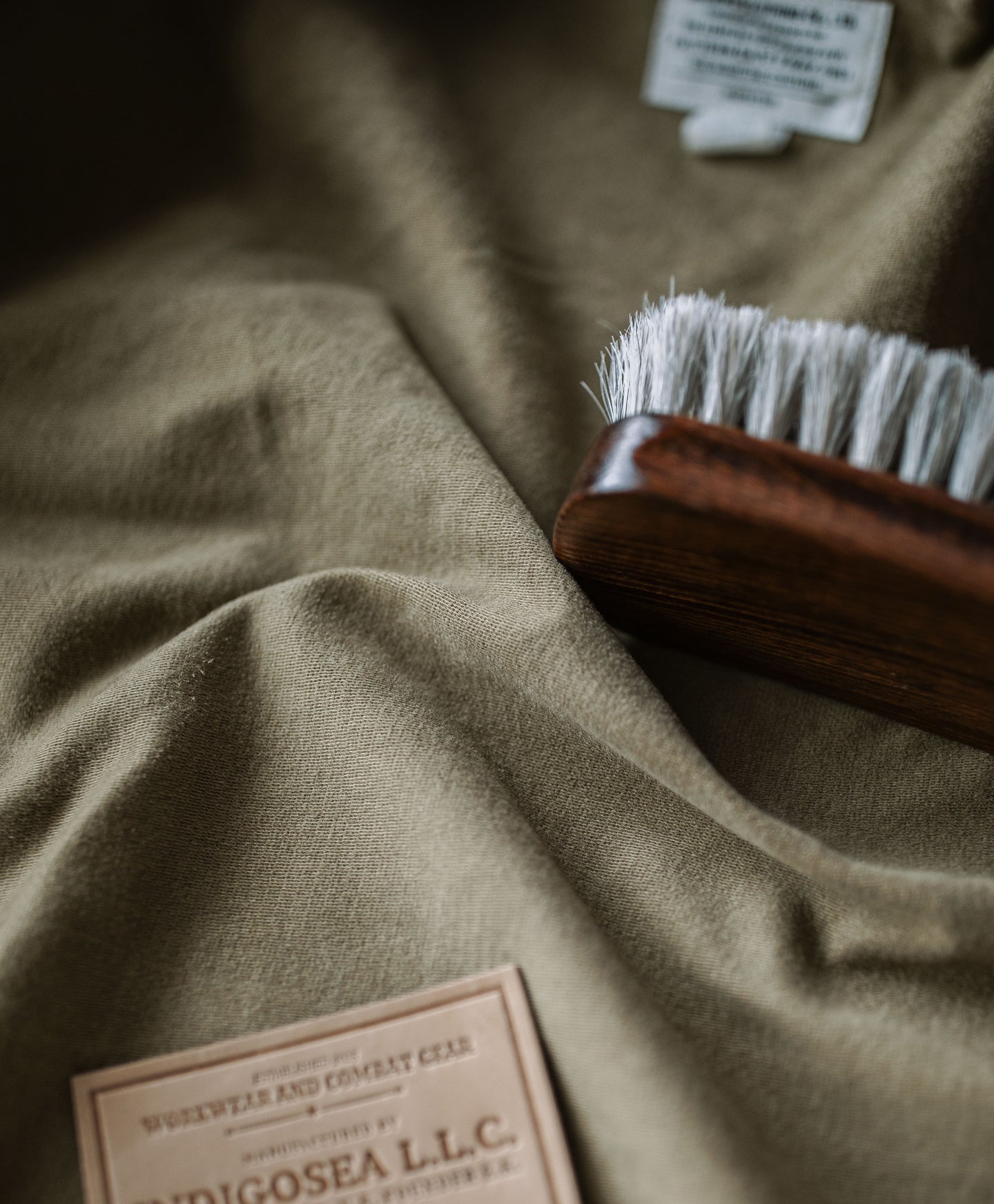 It is a cotton-lined jungle cloth deck jacket made from a specially developed grosgrain weave fabric that is soft yet durable, washed finish for a reminiscent look and feel. Lined at the front with sateen. A throat tie secures the stand-up collar when needed in cold weather.