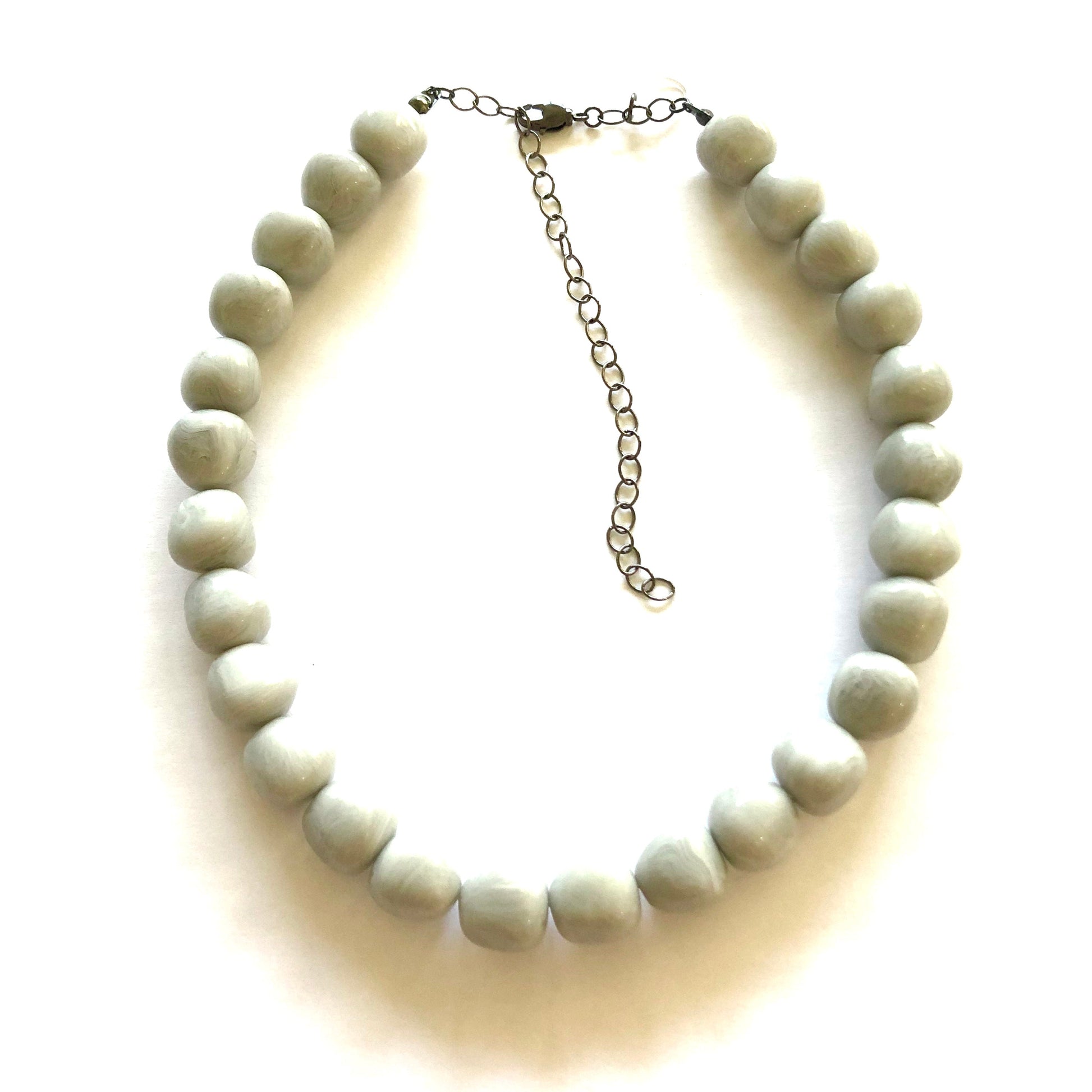 Light grey beaded necklace featuring vintage lucite beads with a fun Baroque apple shape. This single beaded style is known as the Marco necklace. The beads are from the 1980's and are super light weight. Each necklace measures about 16" + a 6" extender. Finished with gun metal colored findings.