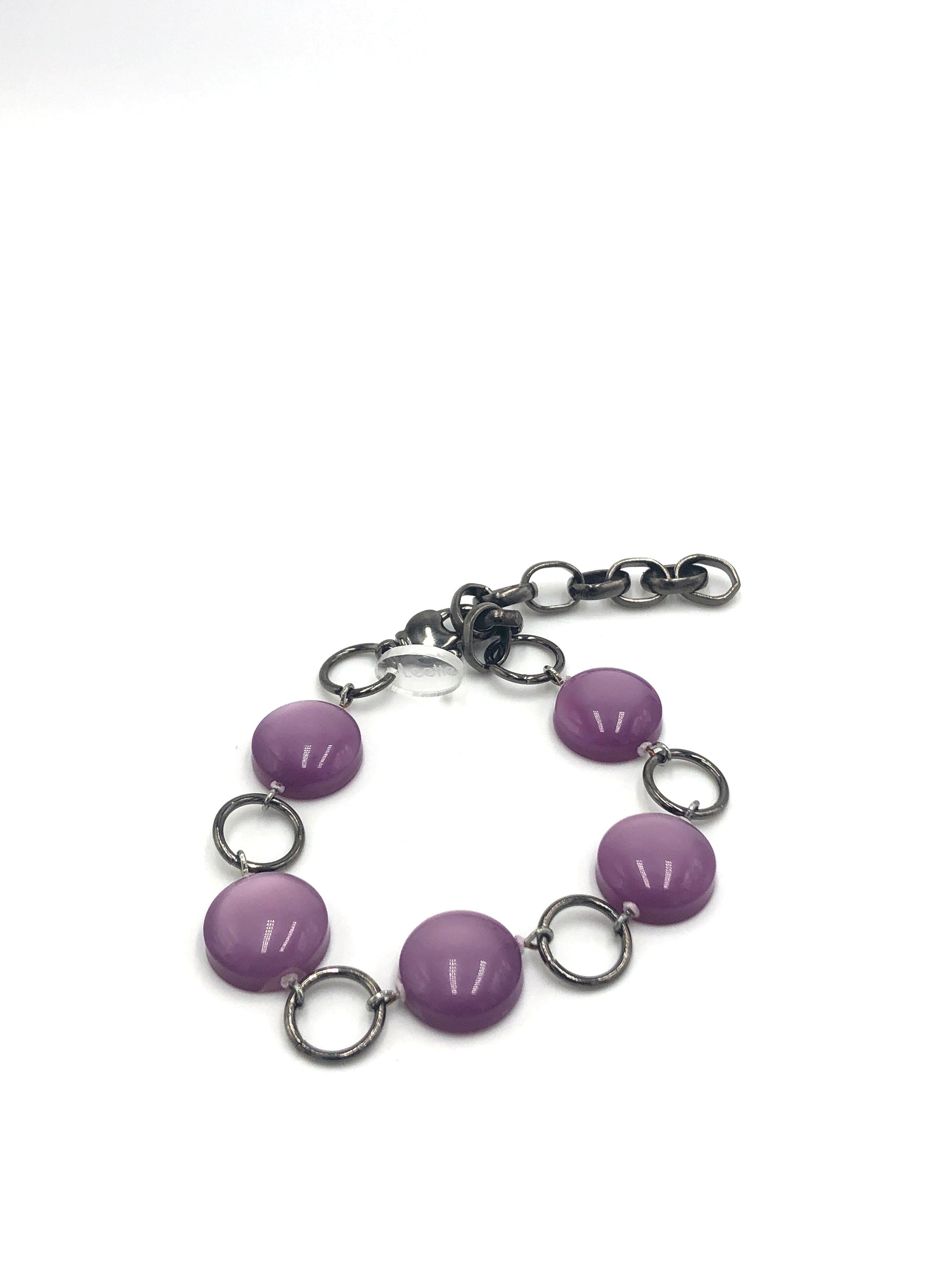 Lucite stations bracelet featuring a gorgeous pastel purple or lavender-lilac color and in a moonglow finish. Each bracelet is made up using a beaded links shape, and gritty gun metal chain. The Stations Bracelet is adjustable to 10". Enough of a statement to be worn on it's own OR stack for an arm party with others. Lots of versatility from 6.5 to 10" and swivel lobster claw makes it so that you can latch a link all by yourself. Light weight with a chunky look.