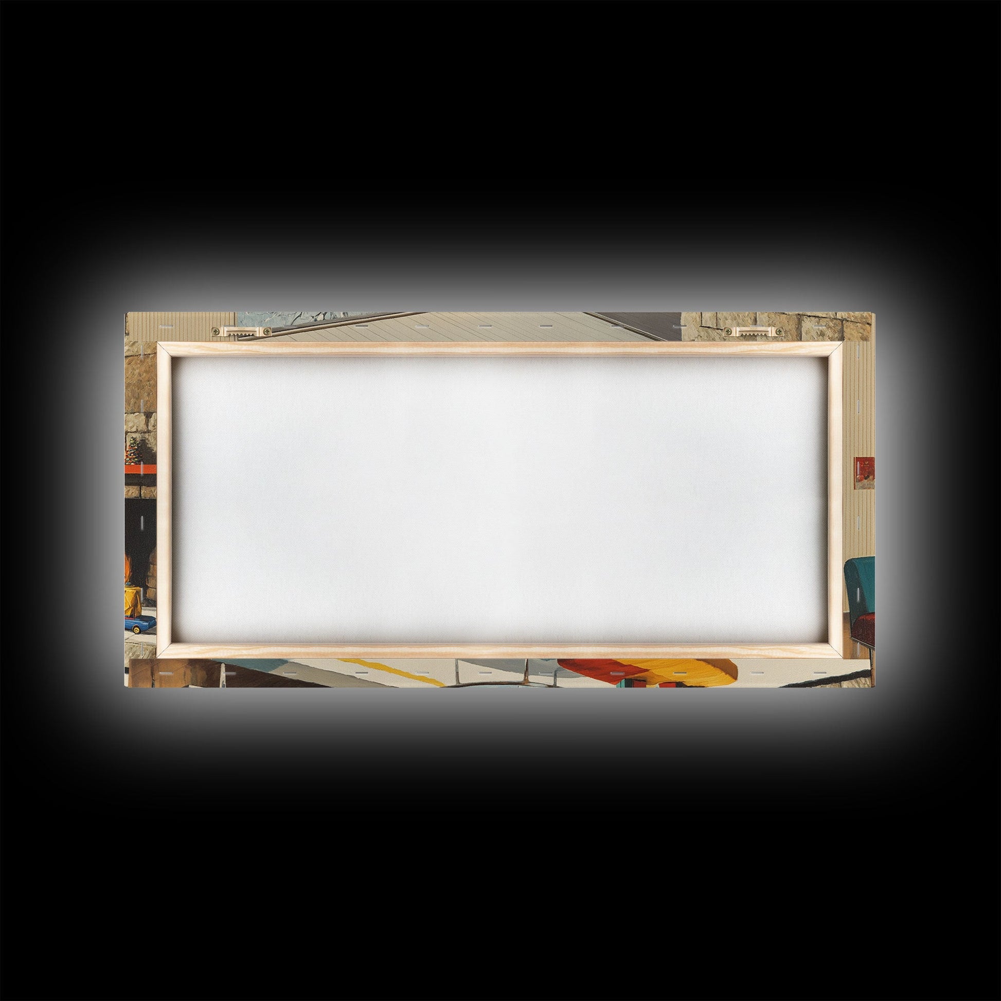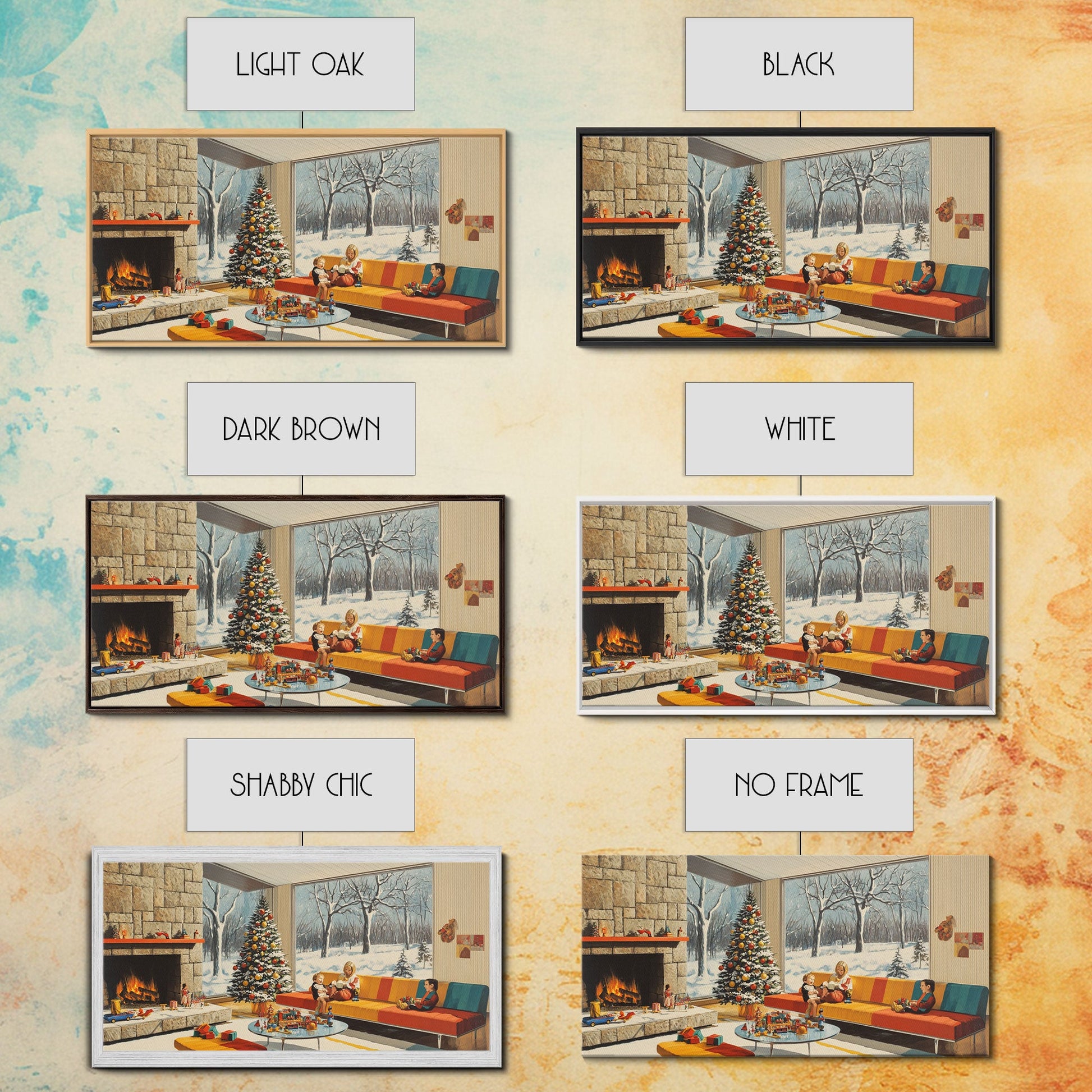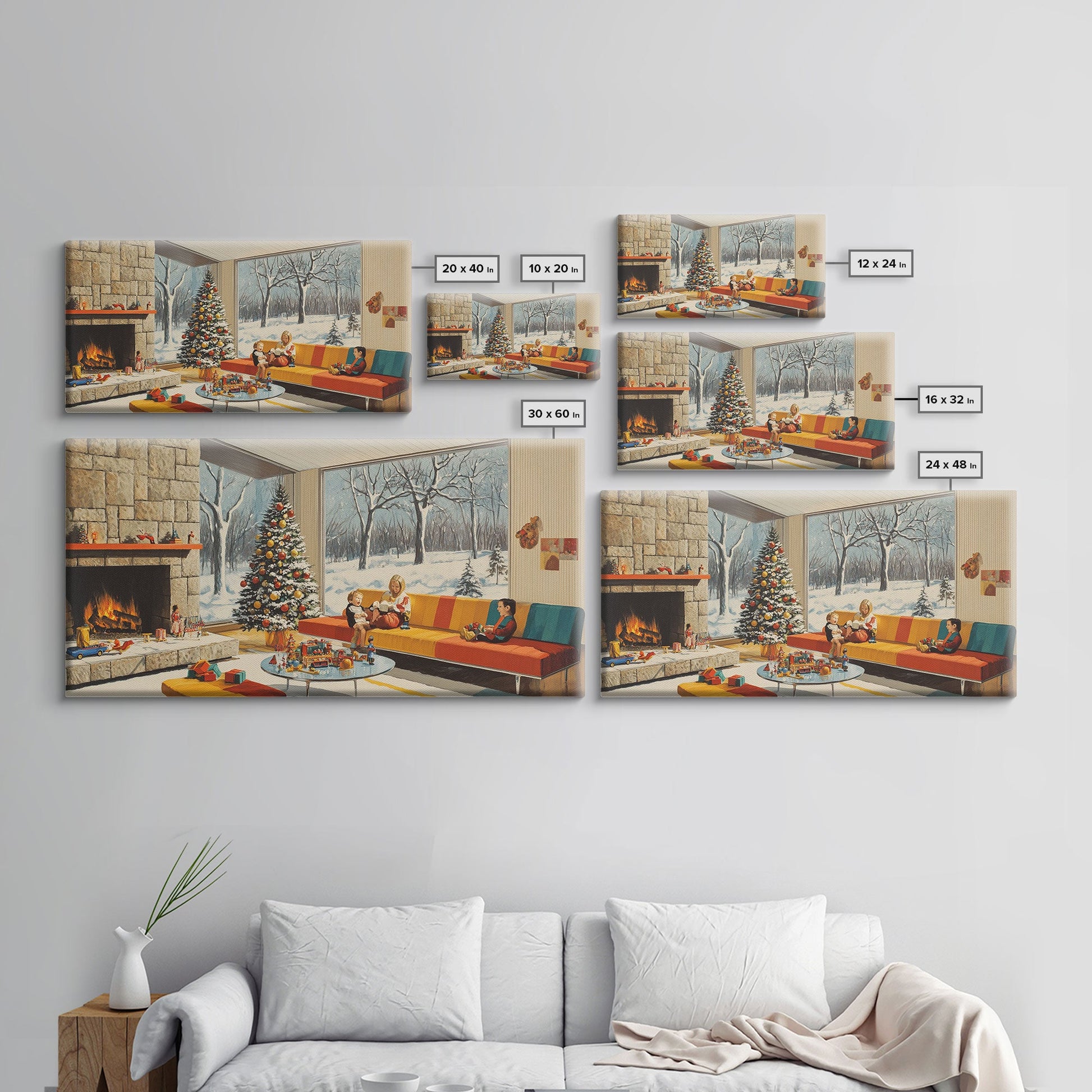 Mid century modern Christmas scene with fireplace and tree, retro Christmas decor, framed canvas print, 1960s Christmas home decor