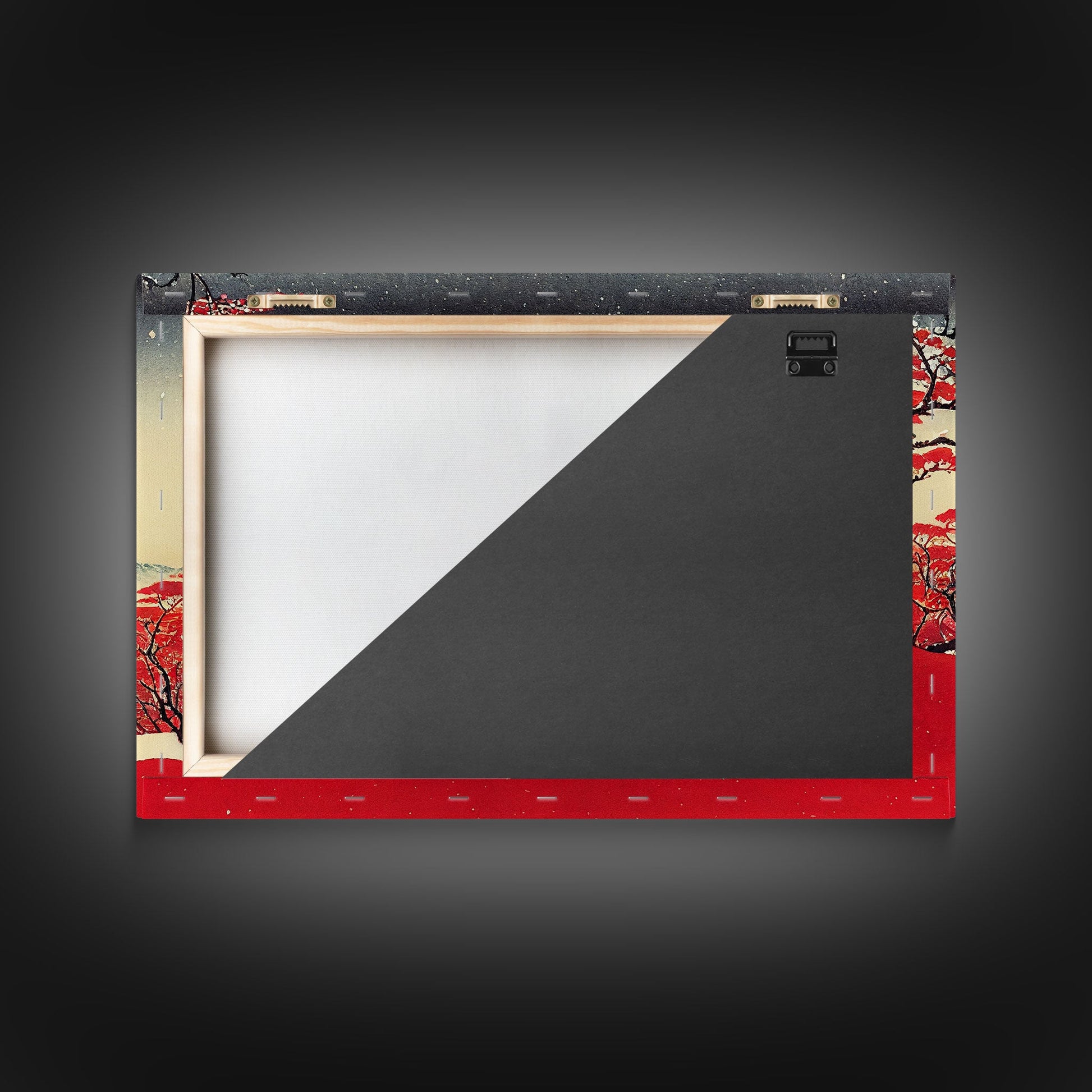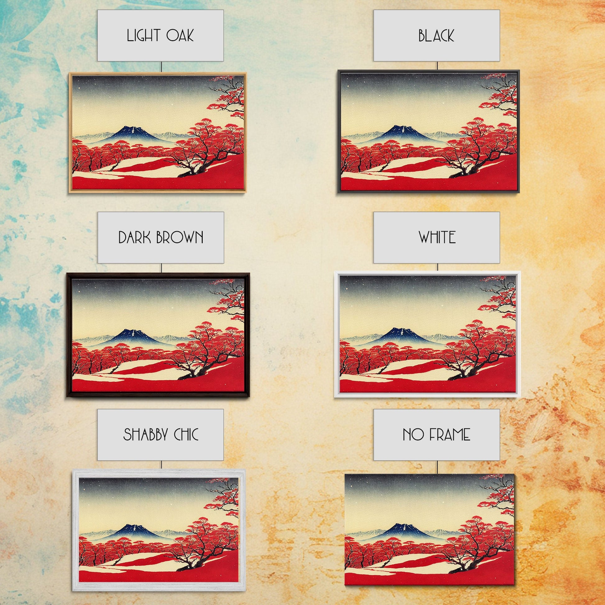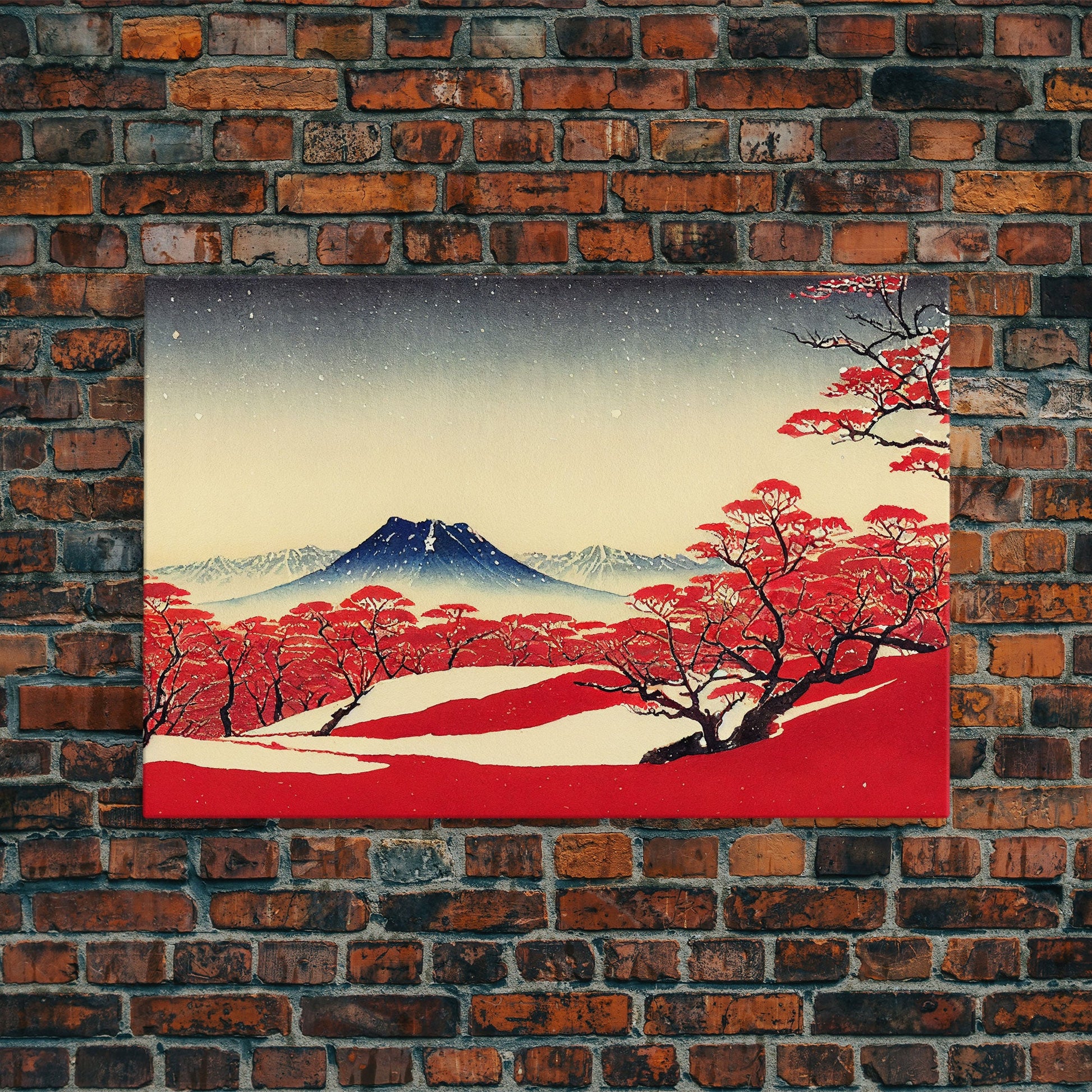Mt. Fuji in the winter, Japanese style art, Japanese maple trees, framed canvas print, unique retro style art