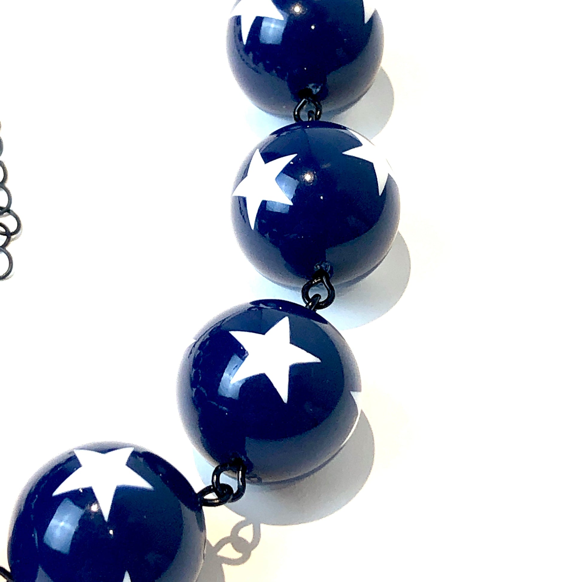 Navy Blue & white, star-studded necklace. Beads are super chunky! This style is known as the Amelia necklace & features hand-linked beads, rosary-chain style. Measures approximately 16" + a 6" adjustable extender. The perfect layering piece!